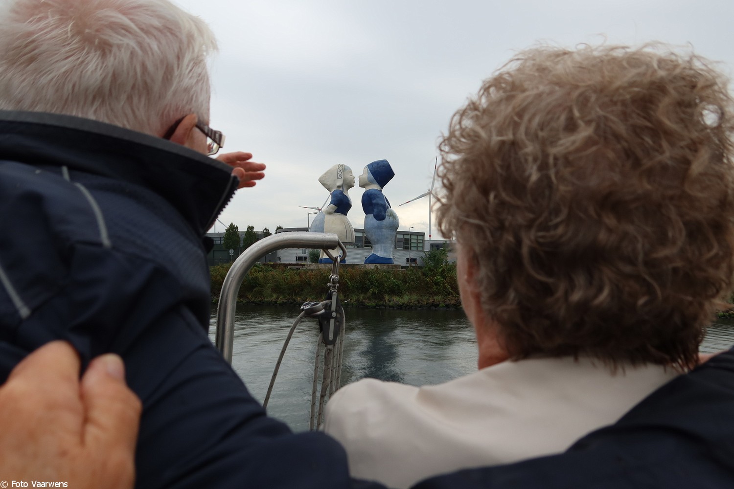 Langzaamaan werd het ook weer tijd afscheid te nemen van de molens en Frouk verraste het gezelschap met een zelfbeeld in de donkere ramen van de Duyvis machinefabriek. De bruggen draaiden allemaal vlot en in no-time waren we terug op het Noordzeekanaal en heel verrassend, de regen hield weer op! Eer rondje langs de “Kissing Puppets” zorgde voor veel hilariteit; oud en jong, het zoenen en foto’s maken kon maar niet stoppen.