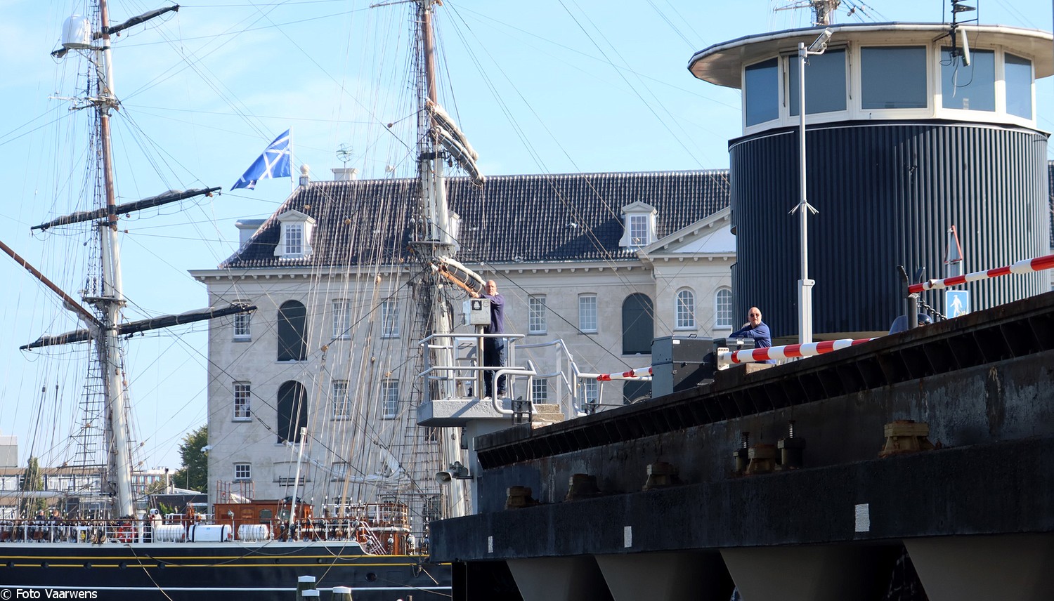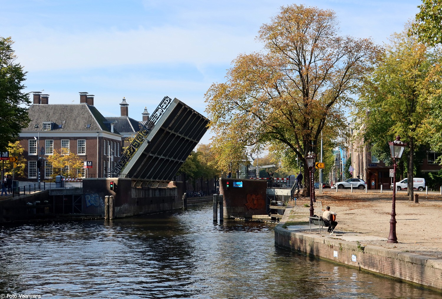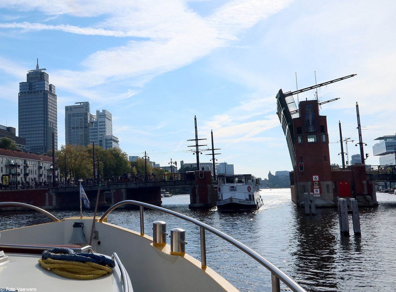 Als de familie aan boord komt rond 11 uur is de mist opgelost en staat de zon hoog aan de hemel. Wind is er bijna niet en we kunnen meteen de tentdoeken op het achterdek openzetten. Na een praatje over de stichting en het schip komt natuurlijk de vraag: Waar gaan we heen? De keuze valt op Amsterdam en de Amstel. Een belletje met Waternet leert dat het mogelijk is. De enige uitdaging is de Berlagebrug die maar tot 12.45 uur bediend wordt en daarna pas weer na 18.00 uur. We willen dan ook tot deze brug varen en daarna weer terug. Dan blijft er ook nog tijd over voor een rondje door de havens.