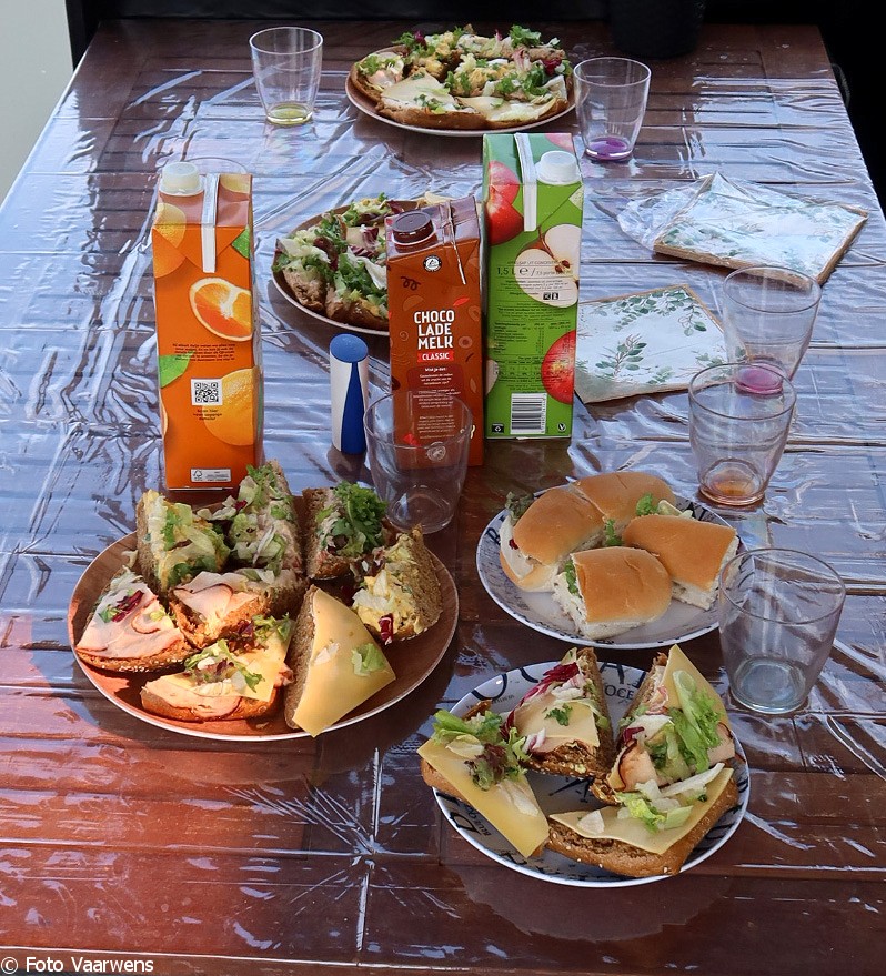 We draaien vanaf de Amstel door de Omvalbrug heen (die door Waternet voor ons in zijn hoogste stand wordt gezet) de Weespertrekvaart op. Daar volgen nog heel veel bruggen waarvan er nog 4 voor ons open gezet worden omdat we er niet onder door kunnen (brugwachters bedankt!). Het is een mooie route en iedereen geniet van de wisselende omgeving en al varende van de lunch die door Françoise is klaargemaakt.