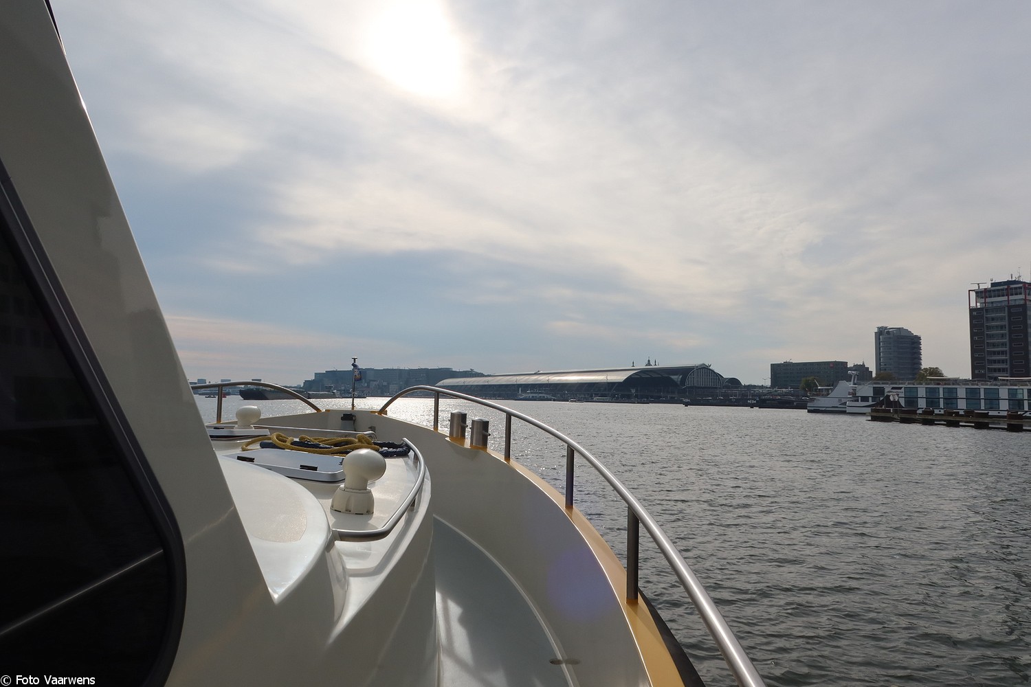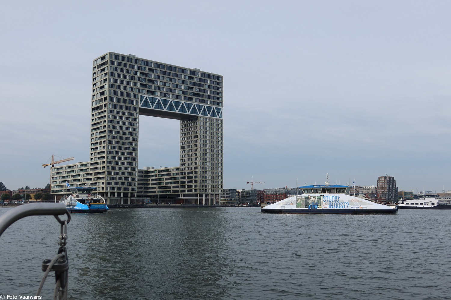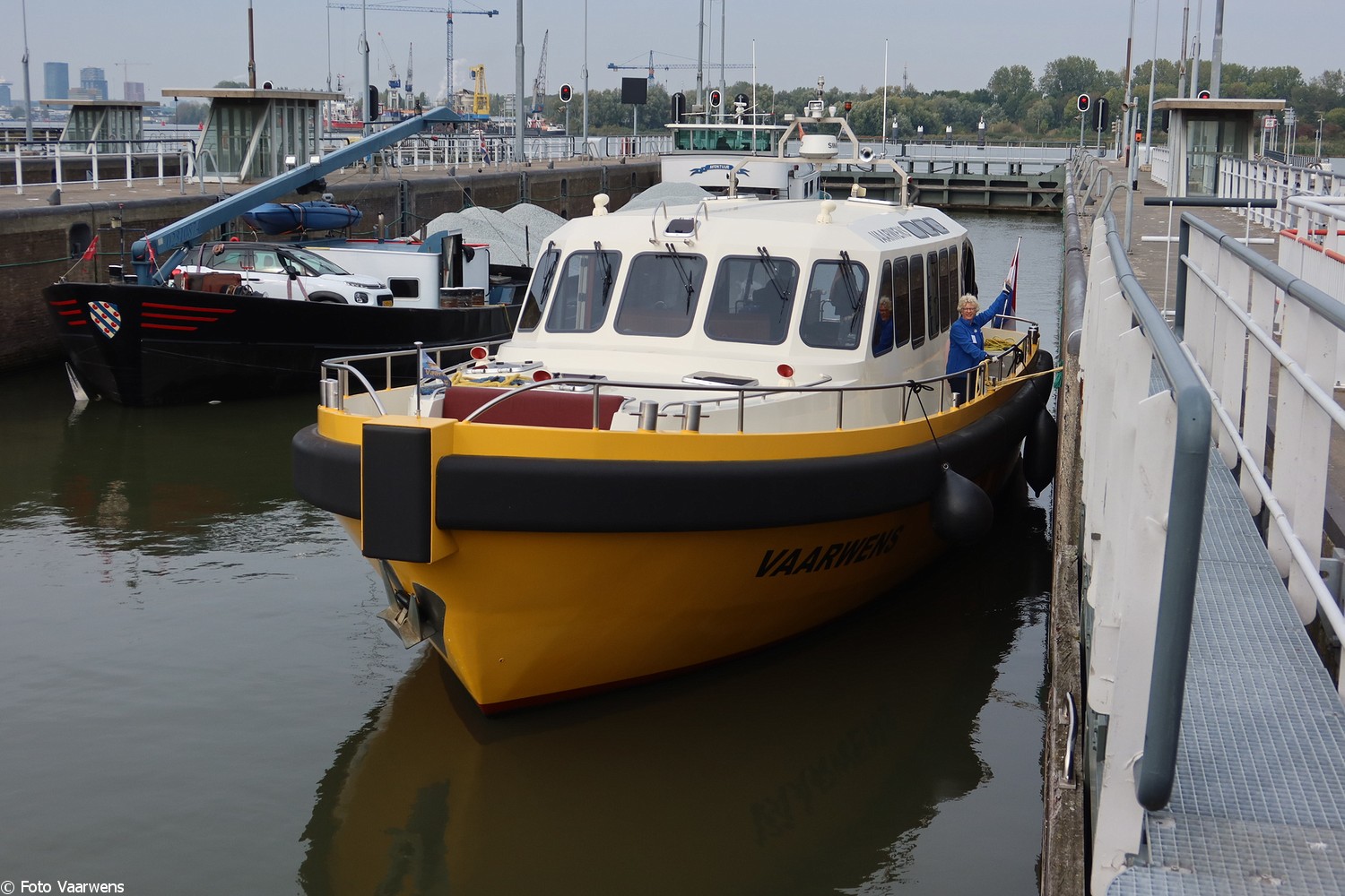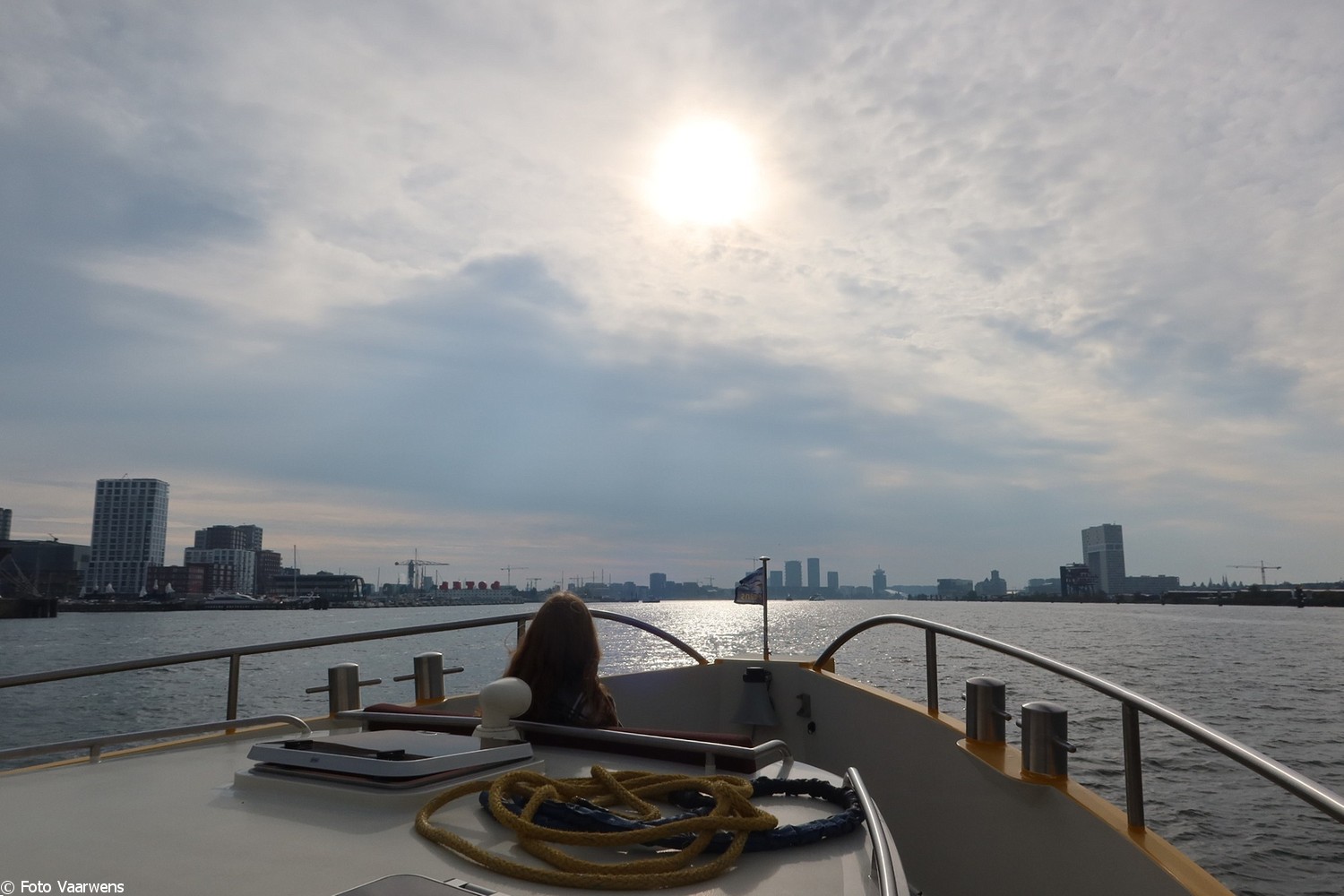 Intussen heeft Mason het roer in handen gekregen, al is “genomen” meer op zijn plaats. Ongenuanceerd schrijft hij met het zog zijn naam in het IJ-water. Met zo nu en dan stevige tegendruk van schipper Klaas vindt de Vaarwens veilig de weg naar de Oranjesluizen. We schutten samen met een vrachtschip. Op het voorschip daarvan een enthousiast begroetende opstapper, die ons toe roept met: Ik volg jullie op facebook. Prachtig werk doen jullie. Ik sponsor ook. Wat geweldig!