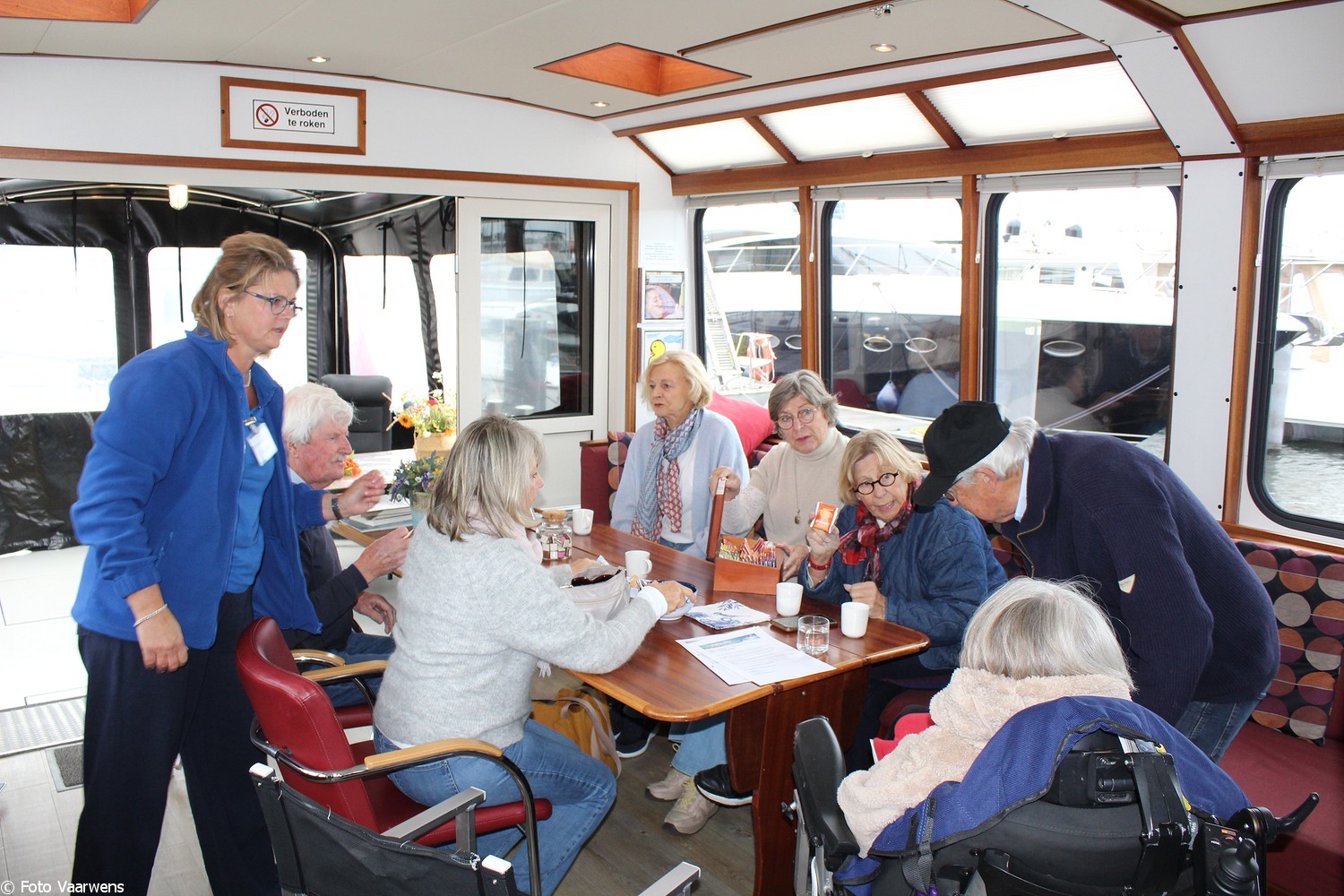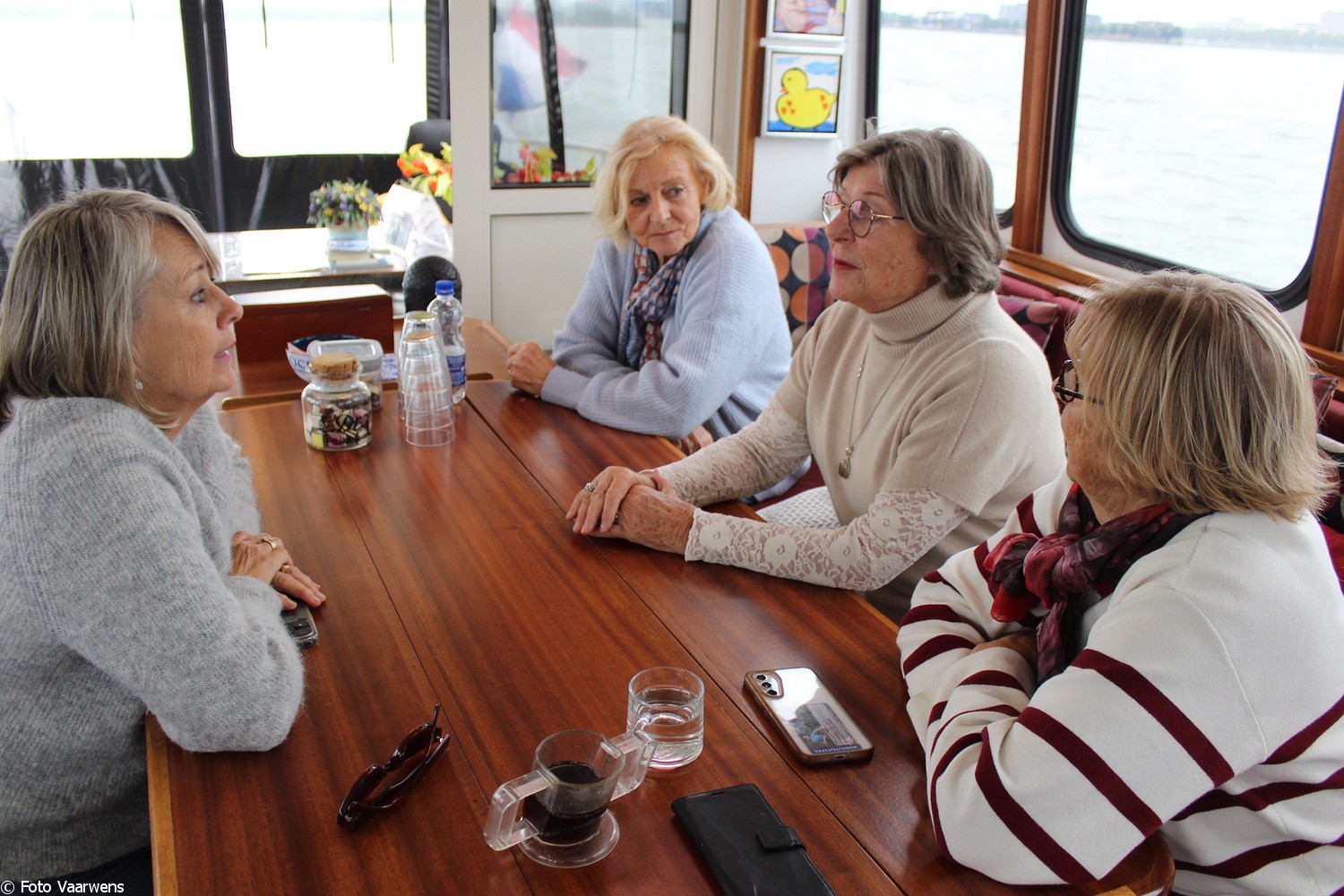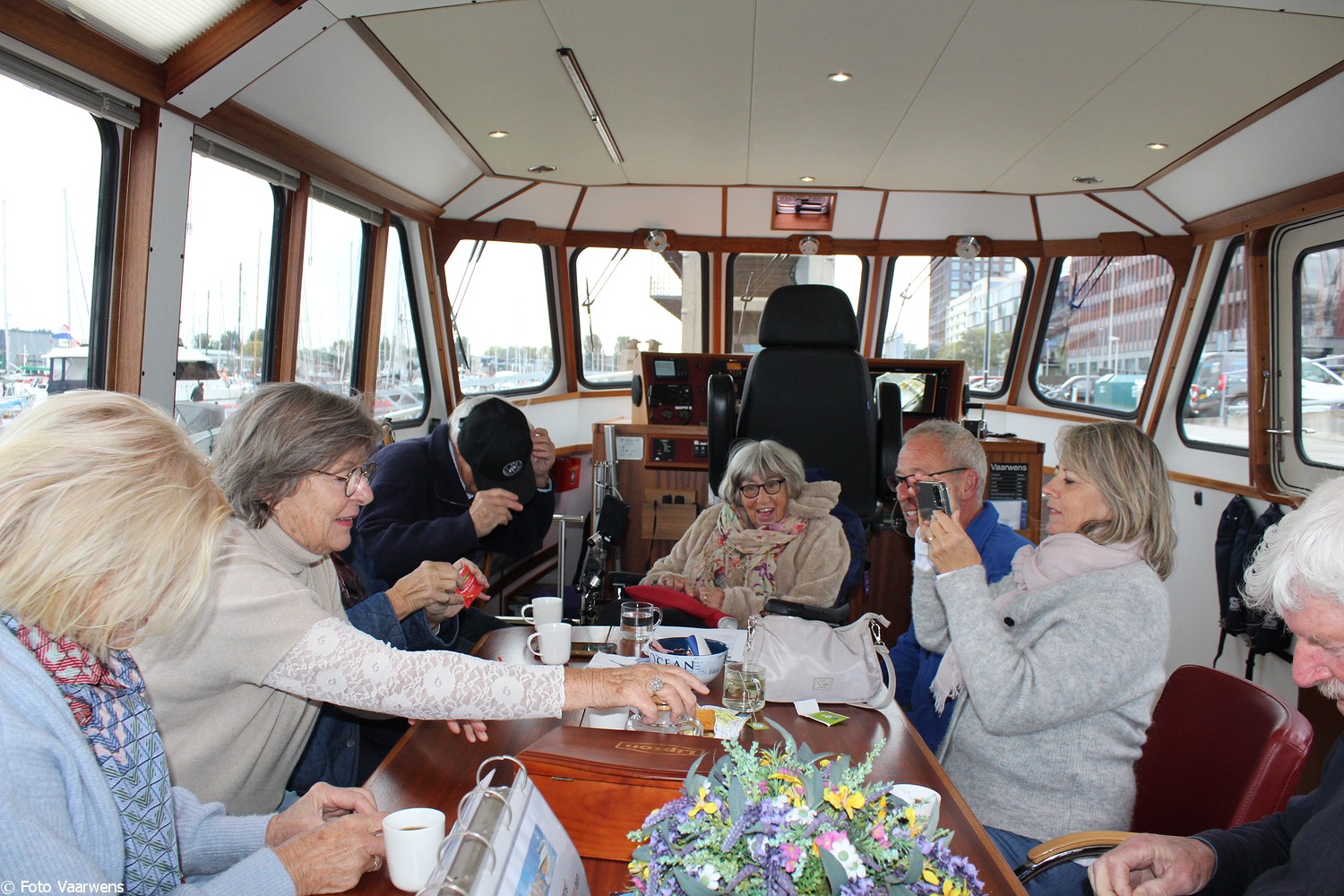 Als iedereen zich om de tafel in de salon heeft geschaard laten we ons de warme drank, koek-en-soes etc. die Riekie ons aanbiedt welgevallen. De hamvraag is natuurlijk waar de reis van vandaag ons zal brengen…Vanwege onderhoud aan de bruggen is de Amstel geen optie, vanwege de verwachte wind zou de oversteek naar Pampus wel eens wat onstuimig kunnen worden... De Zaanse Schans misschien? Of naar IJmuiden? Als de Amsterdamse havens en Durgerdam ter sprake komen zegt de blik van Lyd ons meteen al meer dan genoeg: Dát gaat ‘m worden!