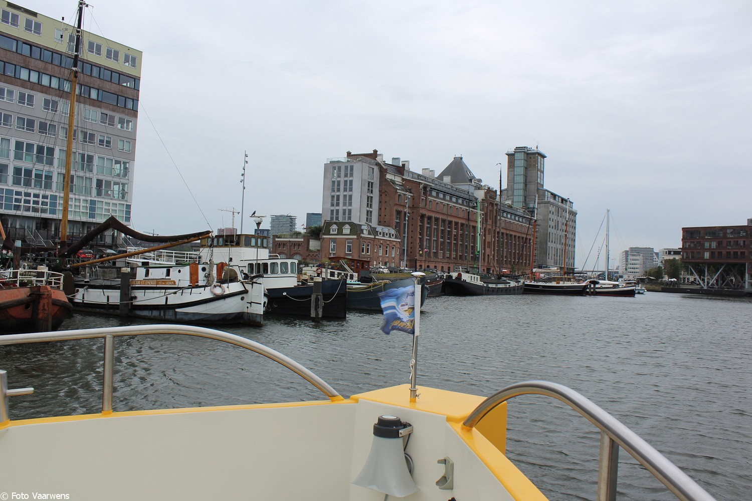 Ton navigeert ons door het hectische verkeer op het kanaal, het IJ, en in de monding van het Amsterdam-Rijnkanaal, om ons vervolgens in de Entrepothaven te doen belanden. Het is ondertussen na de middag, de buikjes knorren, en we meren af om vervolgens met elkaar de lunch te gebruiken. Met het uitzicht op woonschepen en pakhuizen, doen we ons te goed aan wat Riekie ons heeft voorgezet.