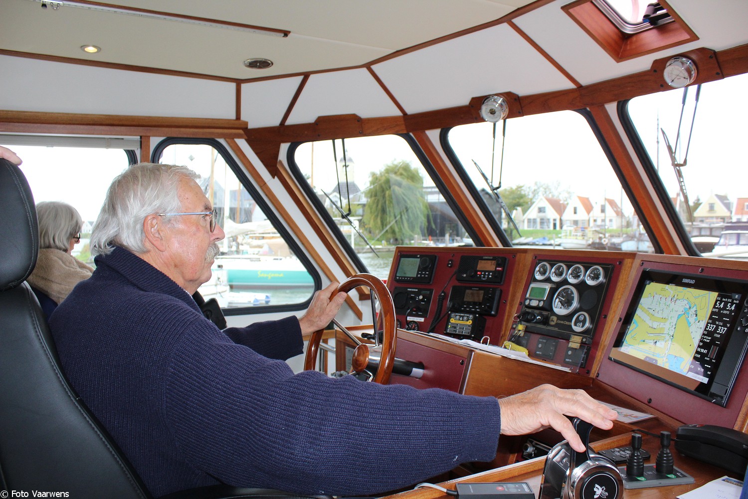 In de haven van Durgerdam manoeuvreert hij het schip behendig rond en zet weer koers naar de Oranjesluizen. De wind neemt behoorlijk toe, de schuimstrepen op het water verraden de windrichting.