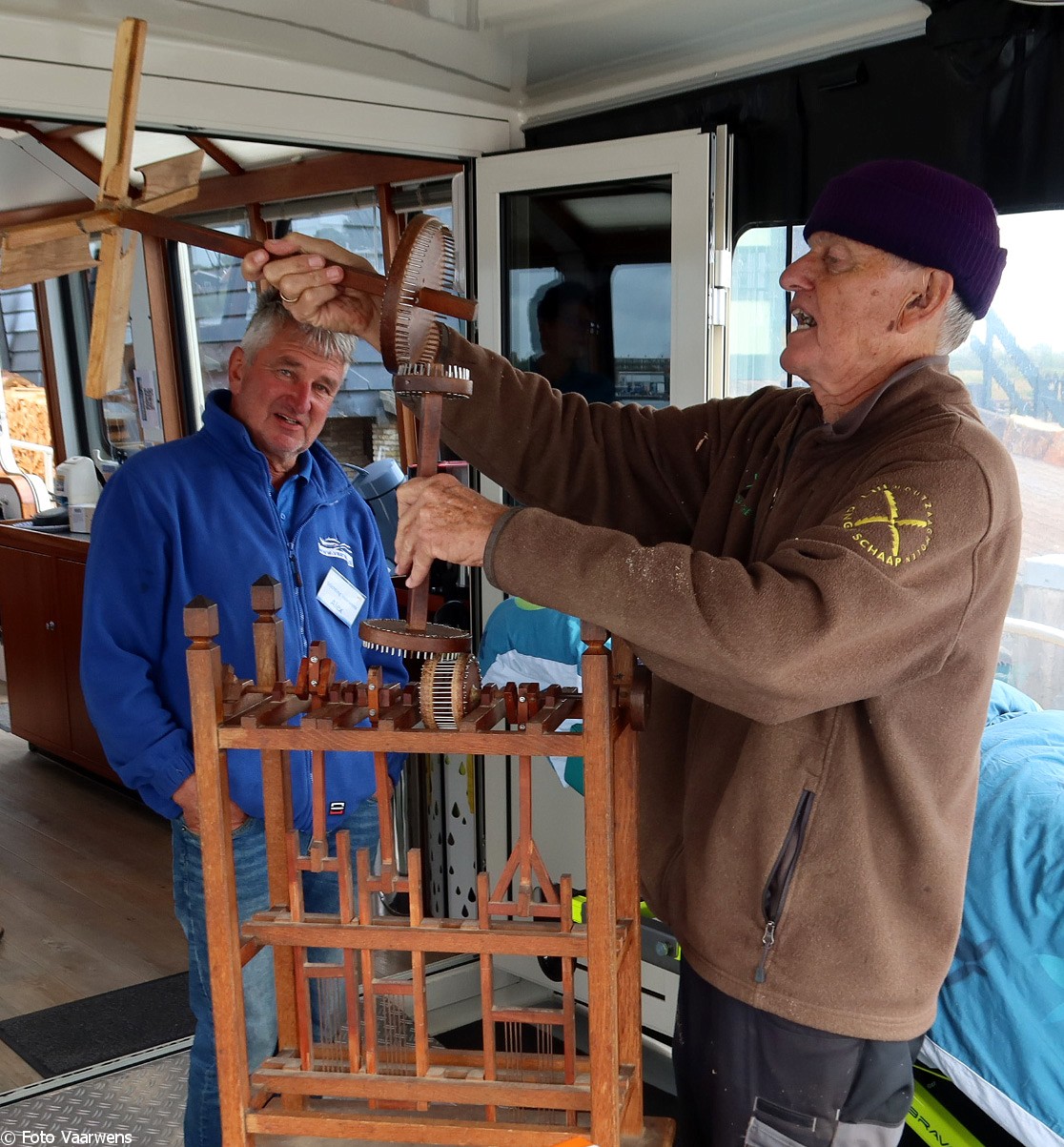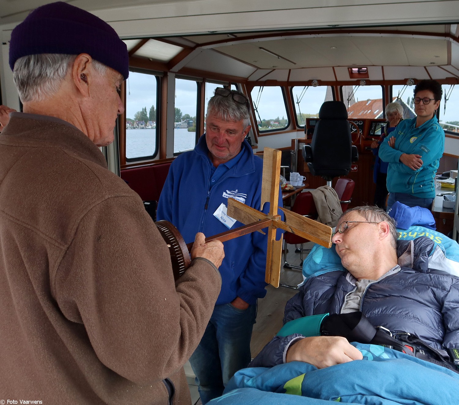 Na de lunch komt de Molenaar aan boord met zijn befaamde schaalmodel van Het Jonge Schaap en geeft een technische uitleg hoe deze houtzaagmolen werkt. De grootte van het grootste wiel van hardhout met de 69 klammen gaat erin als koek. Zo leuk om te zien dat Teun het verhaal heel goed kan volgen. Na deze uitleg aan boord van de Vaarwens gaan zwager en zussen zelf kijken hoe het werkt in de praktijk. Teun blijft liggen op de brancard en doet een tukje.