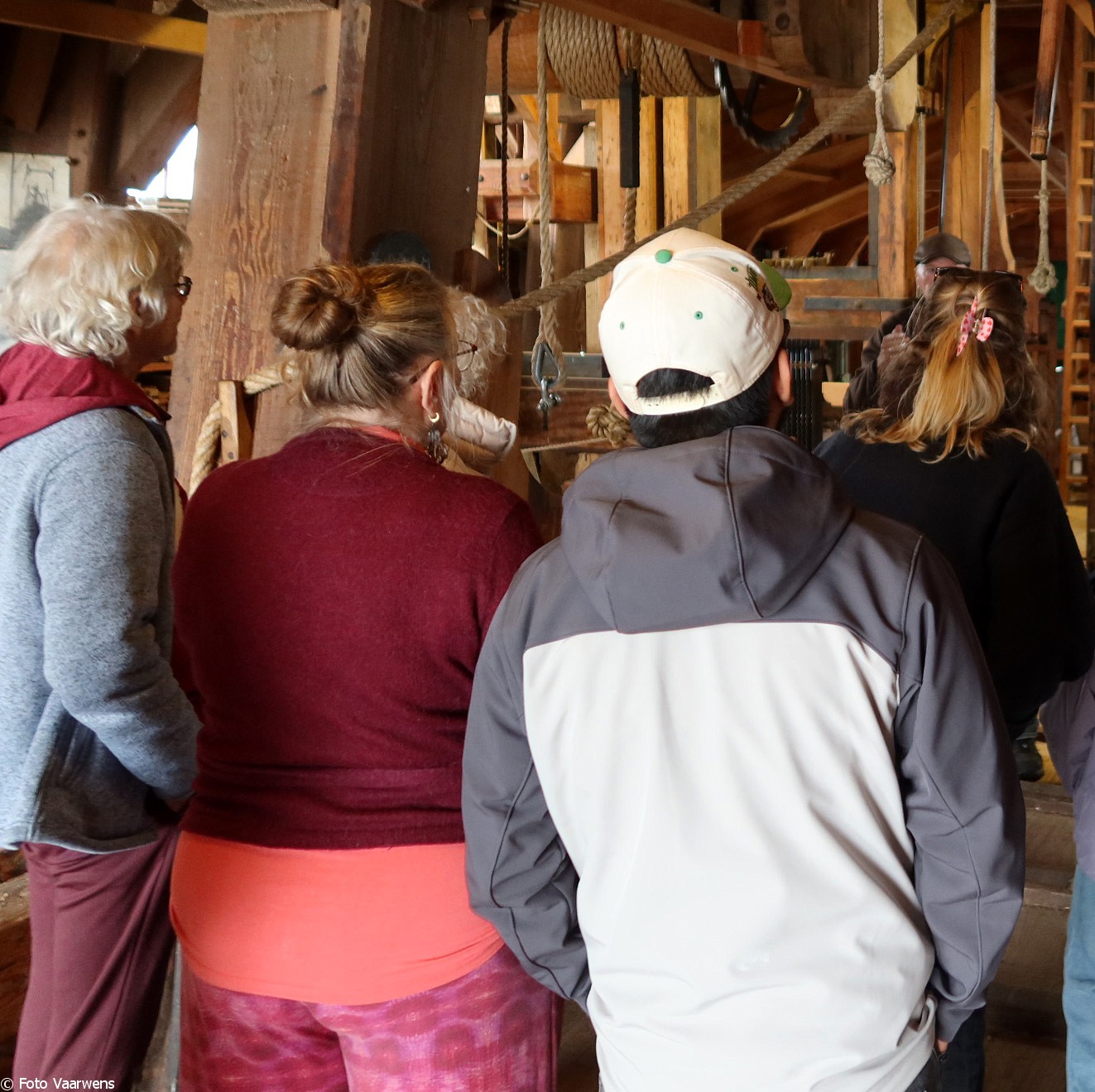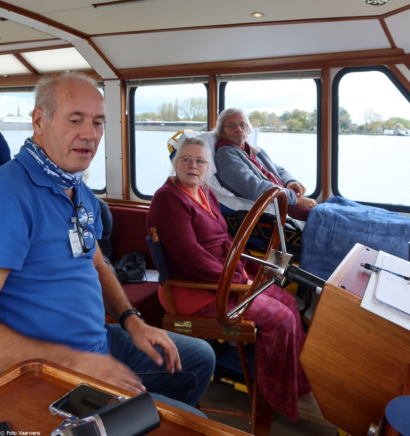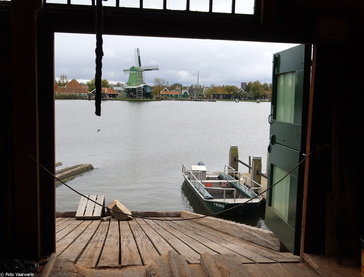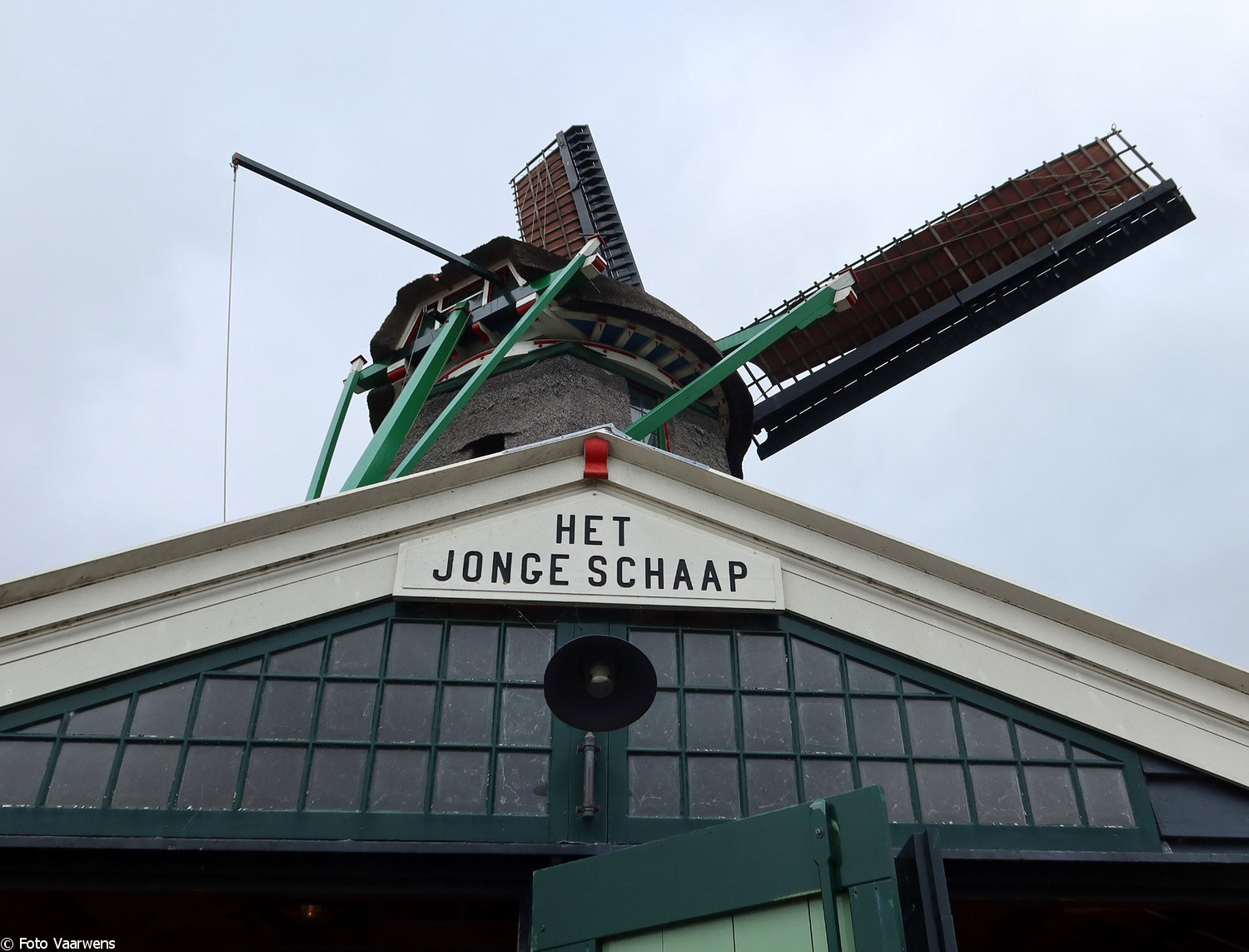 Al snel na het afvaren neemt Robert plaats achter het stuurwiel en stuurt de Vaarwens met ervaren hand richting de Zaan. Dát geeft energie en iedereen geniet van dit bijzondere moment. Doordat de sluis net naar de andere kant schutte toen we er aankwamen en de spoorbrug ook nog niet open kon, liepen we wat vertraging op. We gebruikten die tijd goed door al varend de lunch te nuttigen, zodat we bij de Houtzaagmolen Het Jonge Schaap direct aan wal konden en de molen uitgebreid konden bekijken. Het blijft bijzonder om te zien hoe de enorme boomstammen met behulp van de wind worden gezaagd.