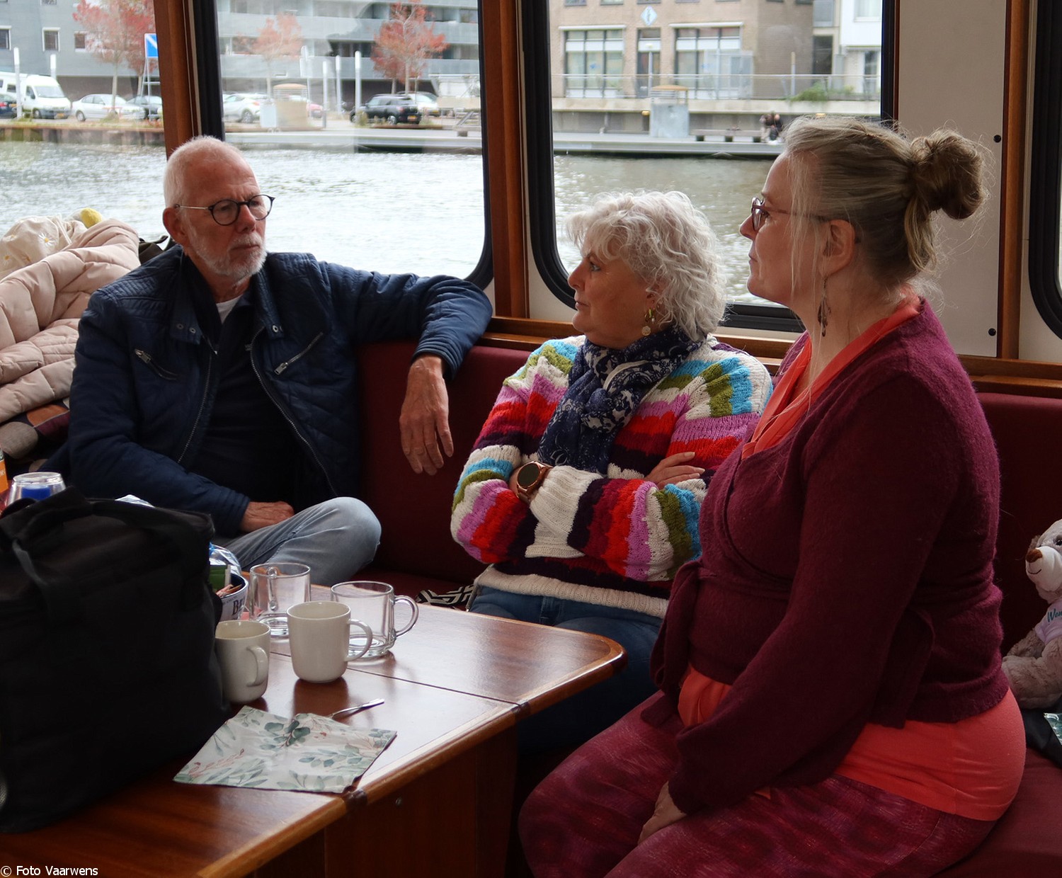 De stemming is opperbest en als Robert van de brancard in de rolstoel wordt geholpen, ontlokt hem de reactie “ik ben niet invalide” en vanaf dat moment neemt hij gezellig op een gewone stoel in de kring rond de tafel plaats. Tijdens de koffie bespreekt schipper Ton de regels aan boord en Julia en Emily begrijpen goed dat de zwemvesten aan blijven en dat er niet gerend mag worden omdat het nog nat en glad is. De keuze waar we naartoe gaan is snel gemaakt door Robert, het wordt de Zaanse Schans.