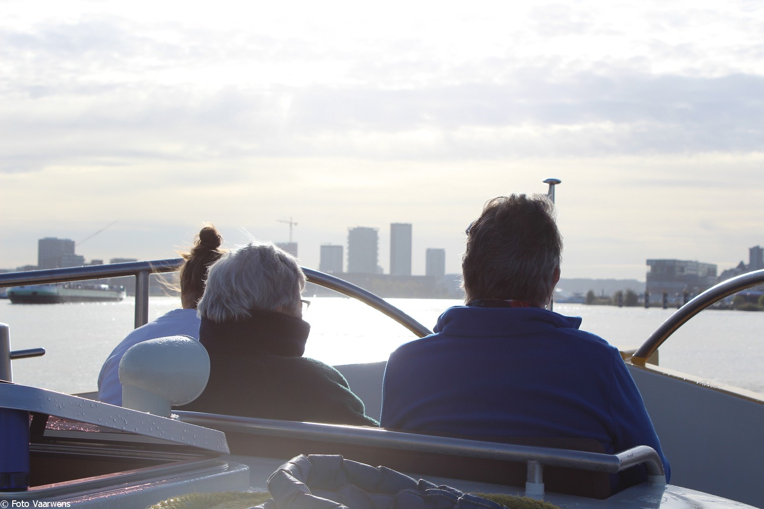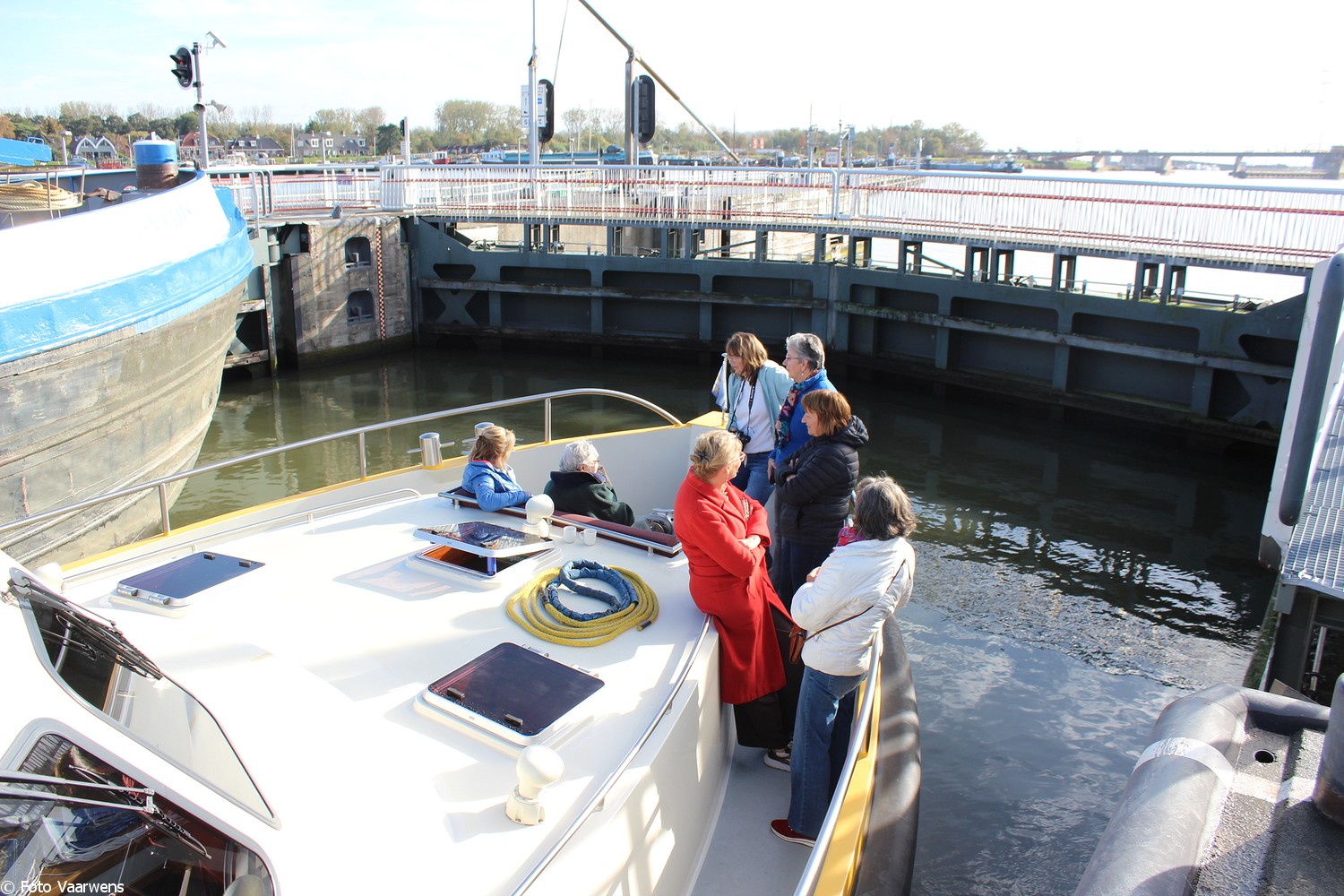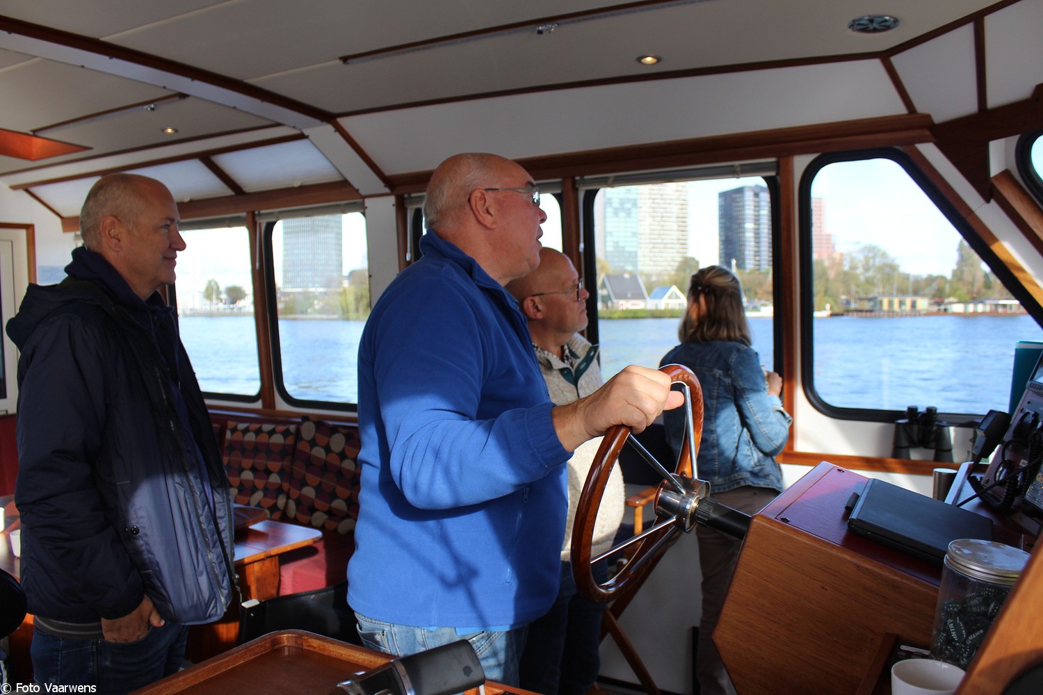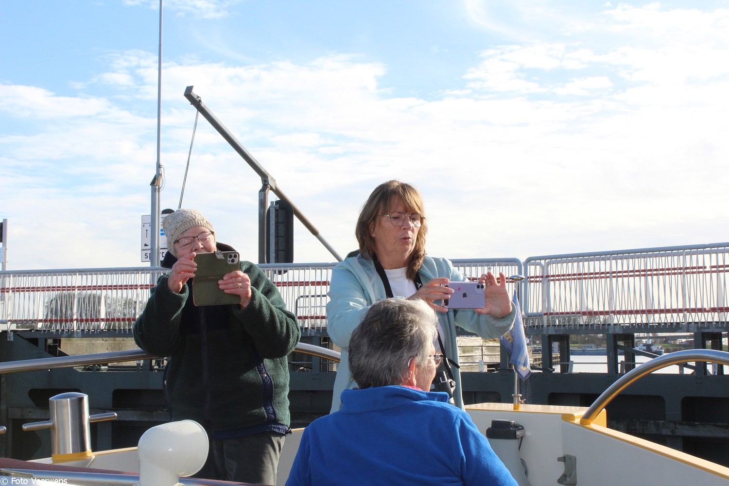 We waren de Marina Haven nog niet uit of Marg liep met haar wandelstok naar het voorbankje en ging daar lekker in de wind uitwaaien. Snel volgden anderen die de wind en de frisse wind trotseerden, want “als Marg buiten wil zitten kunnen wij niet achterblijven”. Met haar jas aan en sjaal om en muts op, had Marg het helemaal naar de zin. Het hele gezelschap stond voorop toen we over het IJ naar de Oranjesluizen voeren en de Vaarwens lag zelfs over stuurboord.