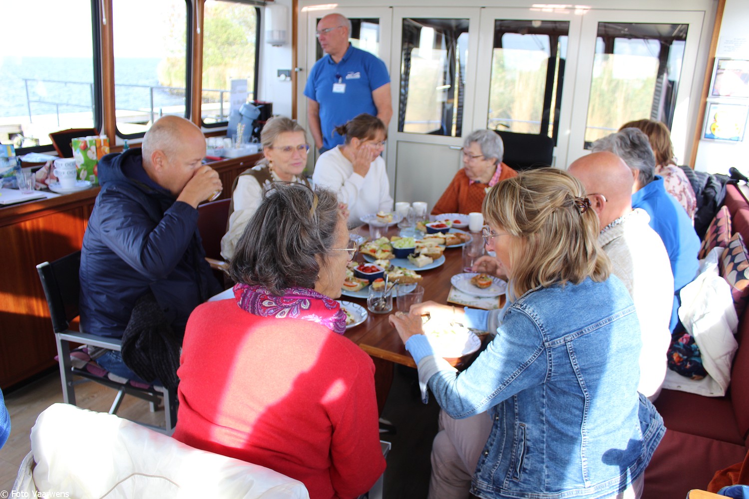 Marg is 8 jaar geleden door een ziekte getroffen, maar nu is de ziekte uitgebreid en is Marg uitbehandeld. Marg is nog zo energiek als een jonge bloem en geestelijk zeer scherp. Nadat er aan boord was ingeklaard en Danny de lekkernijen en koffie/thee had ingeschonken, werd de intro van de stichting verteld en het dagprogramma doorgenomen. De Zaanse Schans had Marg al vaak gezien en het ruime sop trok haar wel. Als we naar Pampus zouden kunnen varen…. en de ogen van Marg begonnen te twinkelen.