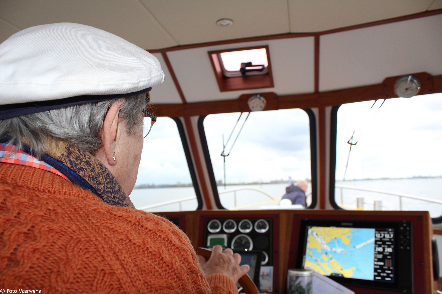 De andere opvarenden hebben gebruik gemaakt van de gastvrijheid van Fort Pampus en zichzelf goed vermaakt met de “ballonvaart”. Om 14.00 uur werden de touwen weer losgemaakt door boots Danny en kon de terugreis beginnen. Marg die enkele maanden geleden haar rijbewijs had verlengd, maar door uitval van haar linkerbeen niet meer kon autorijden, is overgeleverd aan een scootmobiel. Dus als je een scootmobiel kunt besturen, kun je ook varen! Marg werd op de stuurstoel geholpen en voer de Vaarwens probleemloos van Pampus naar de Oranjesluizen. Met de kapiteinspet op, zo stoer!