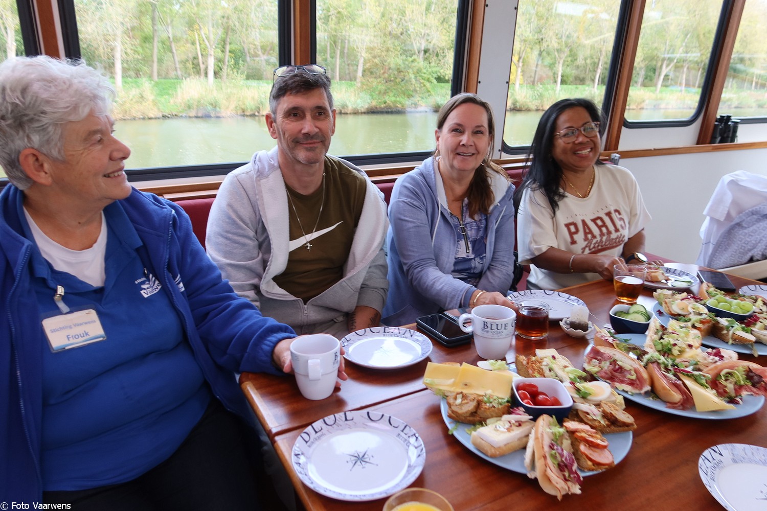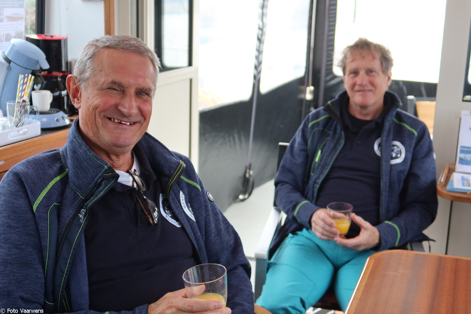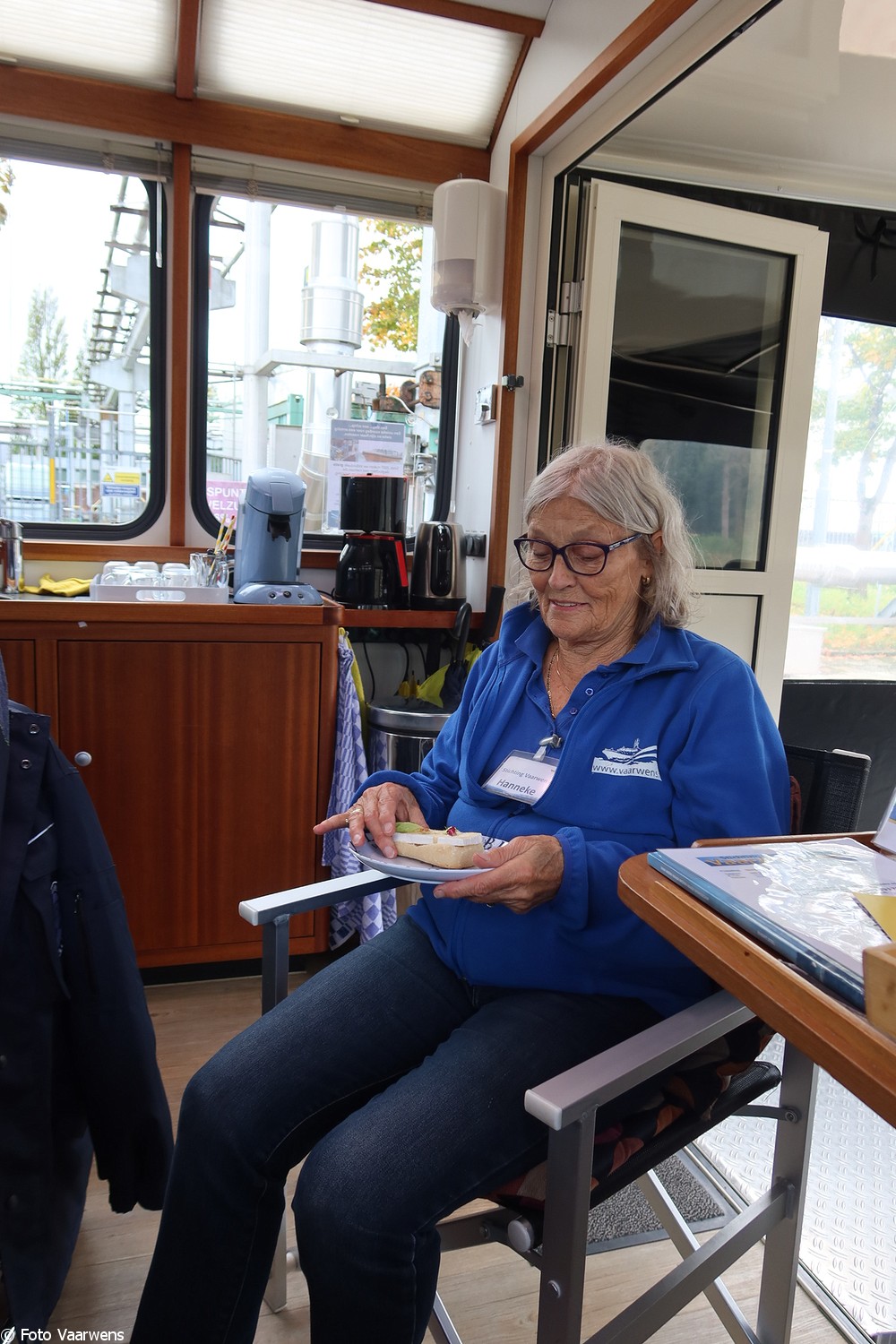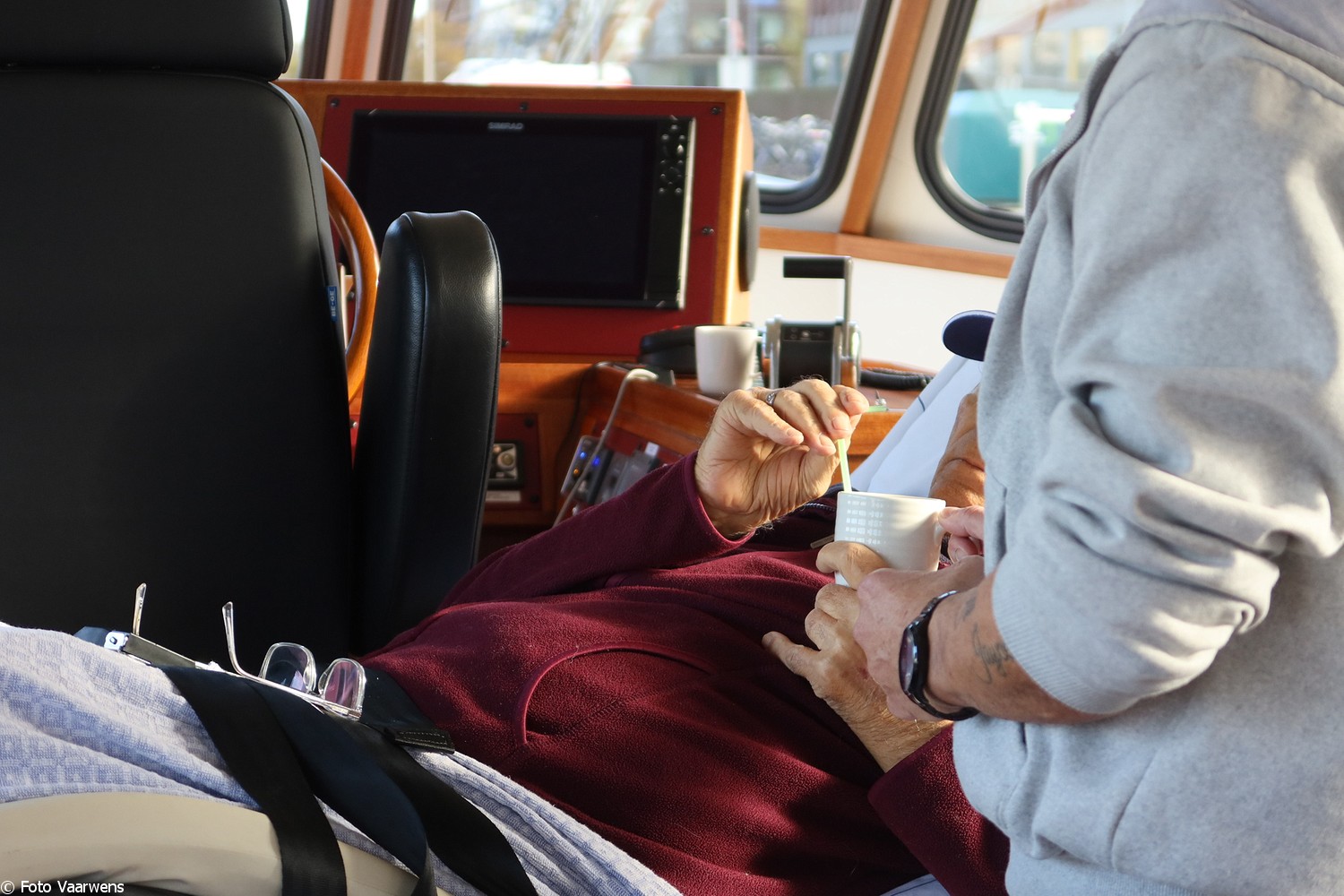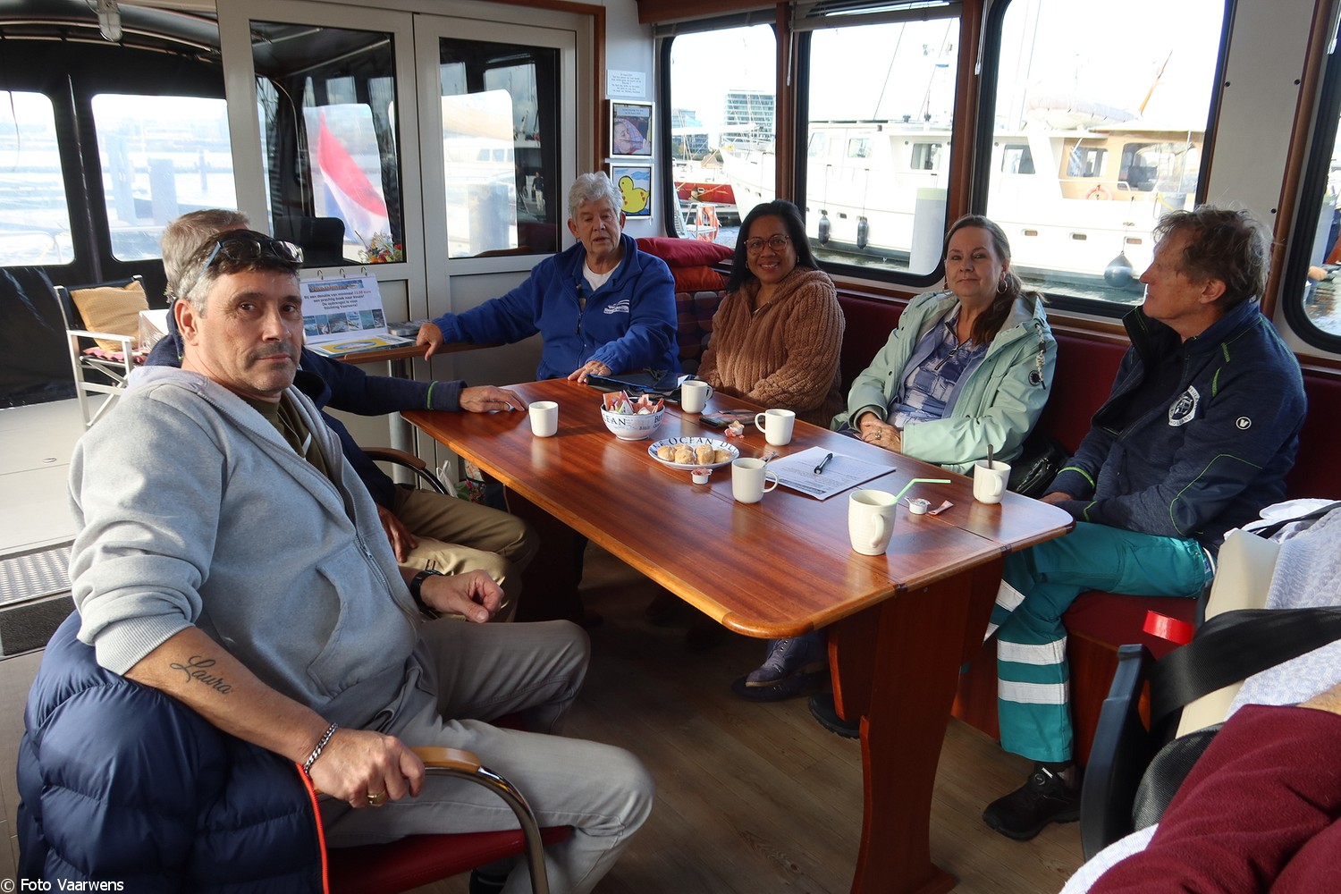 Ons gezelschap neemt plaats in de kajuit en al snel geurt het heerlijk naar koffie en voor de liefhebbers thee. Heerlijke soesjes ontbreken natuurlijk niet. Jan lust ook wel graag een kopje koffie en geeft aan daar veel melk in te lusten. Eigenlijk wil hij graag een beker warme melk met een beetje koffie. Alles kan op de Vaarwens en wat niet kan, dat maken we gewoon mogelijk. Frouk breng een klein bezoekje bij de “goede buur” Loetje en komt met melk terug “natuurlijk helpen we, dat doen we graag als het ff kan”. Dank daarvoor, Jan heeft ervan genoten en het niet bij één bakje gelaten!