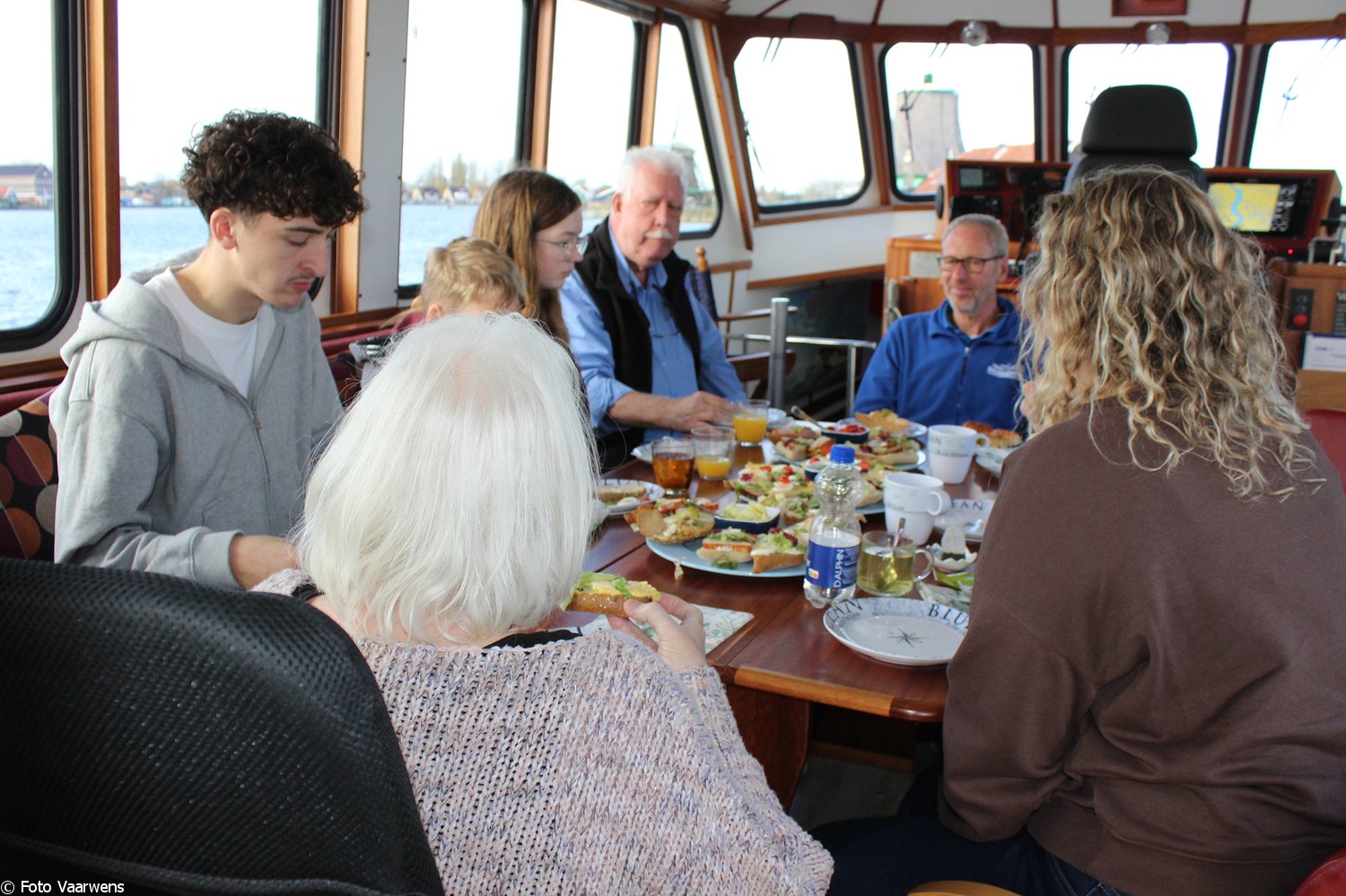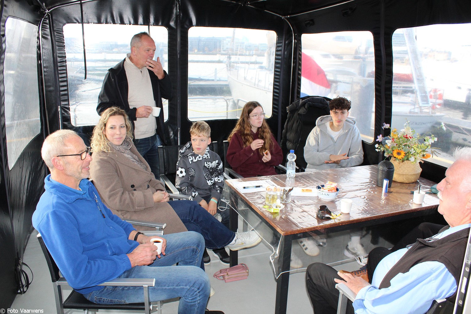 Op de kade begroeten we onze vaargaste Jeannette (geb. 1954) en haar man Ad. Zij worden vergezeld door hun dochter Nousjka, haar partner Pascal en hun drie kinderen Erblin, Saar en Harvey. Aan boord gekomen nestelen we ons in de kuip en doen ons tegoed aan de warme drank en versnaperingen die boots Danny ons voorzet.