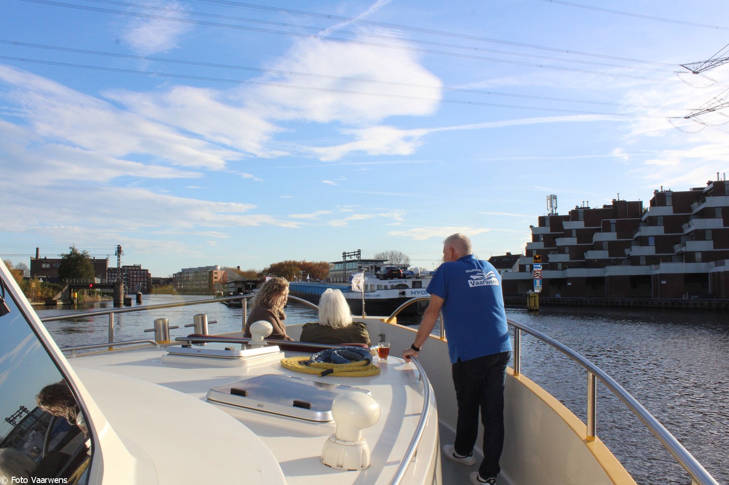 De sfeer aan boord is ‘blij’, anders kan ik het niet omschrijven als ik naar de gezichten van onze gasten kijk… De ‘afslag’ naar zijkanaal G wordt genomen, het Zaanse Gat, waar al snel de Wilhelminasluis in zicht komt.