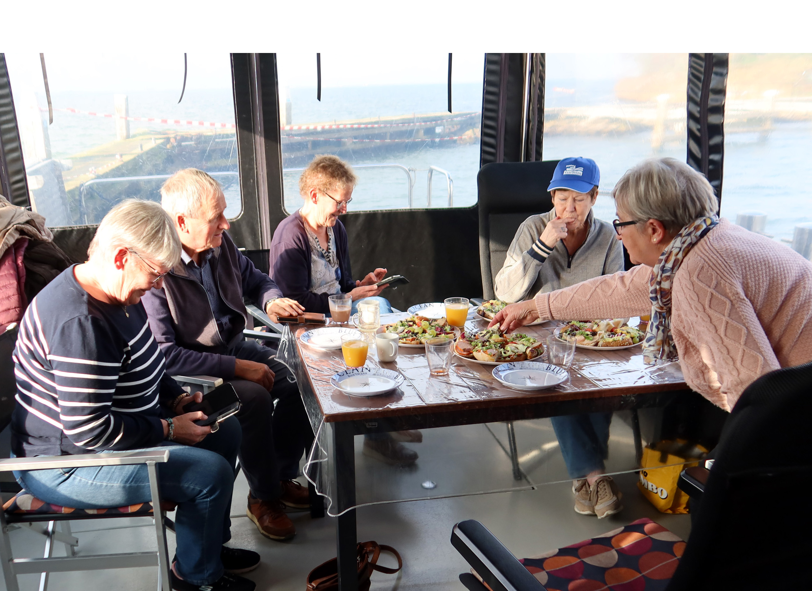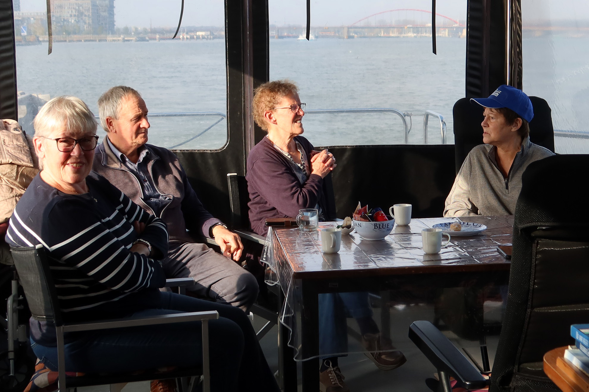 Onze gast Truus (geb. 1952) komt uit een gezin van 9 kinderen en is vandaag met 3 van haar zussen, 1 broer, schoonzus en zwager aan boord. Ze zijn al vroeg met 2 auto’s vanuit Weert in Limburg vertrokken naar Amsterdam. Helaas is de partner van Truus niet mee vandaag omdat hij zich niet goed genoeg voelde om mee te kunnen. De gasten hebben echte Limburgse vlaai meegenomen, waarvan we direct bij een kop koffie van genieten.