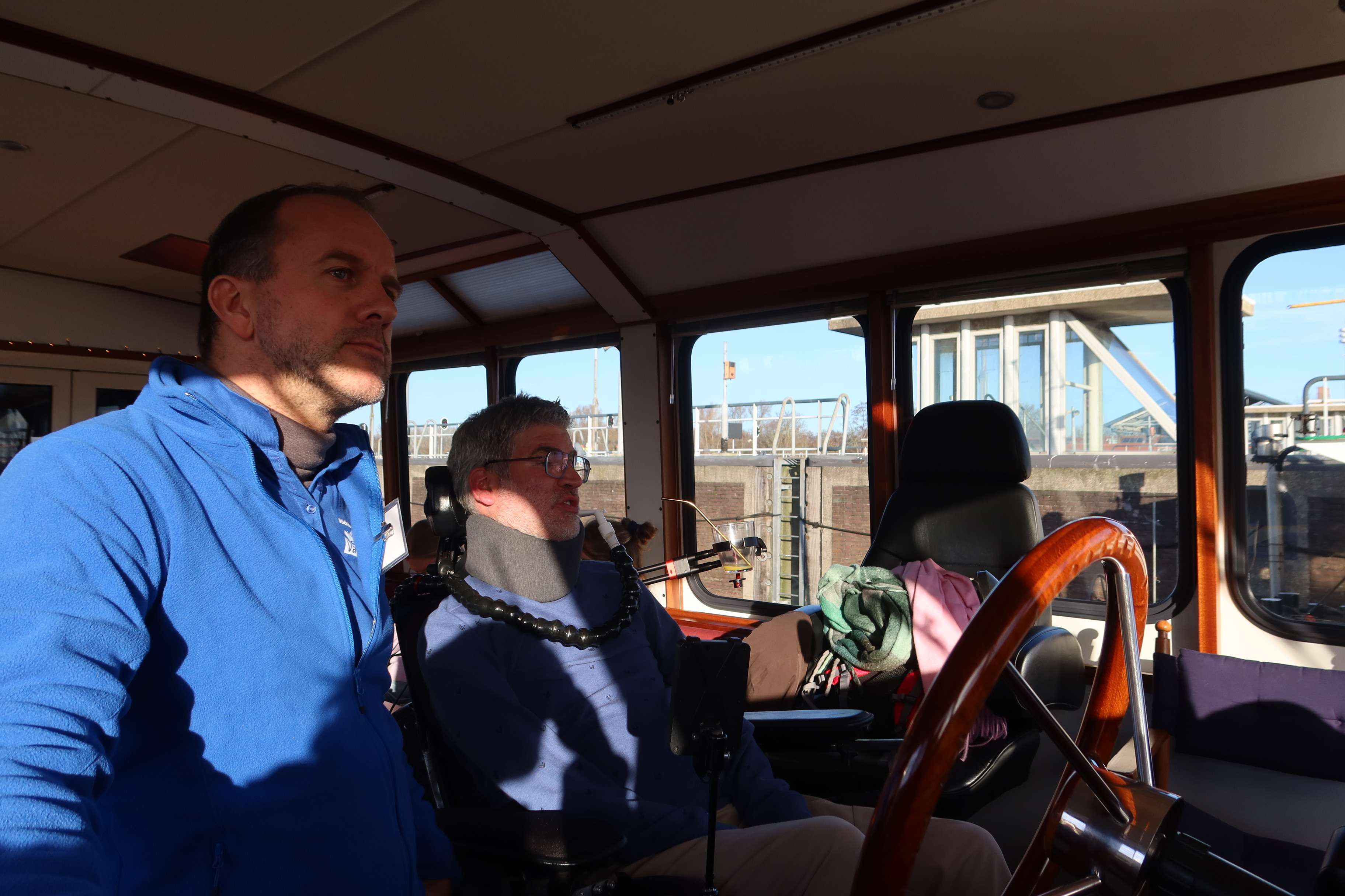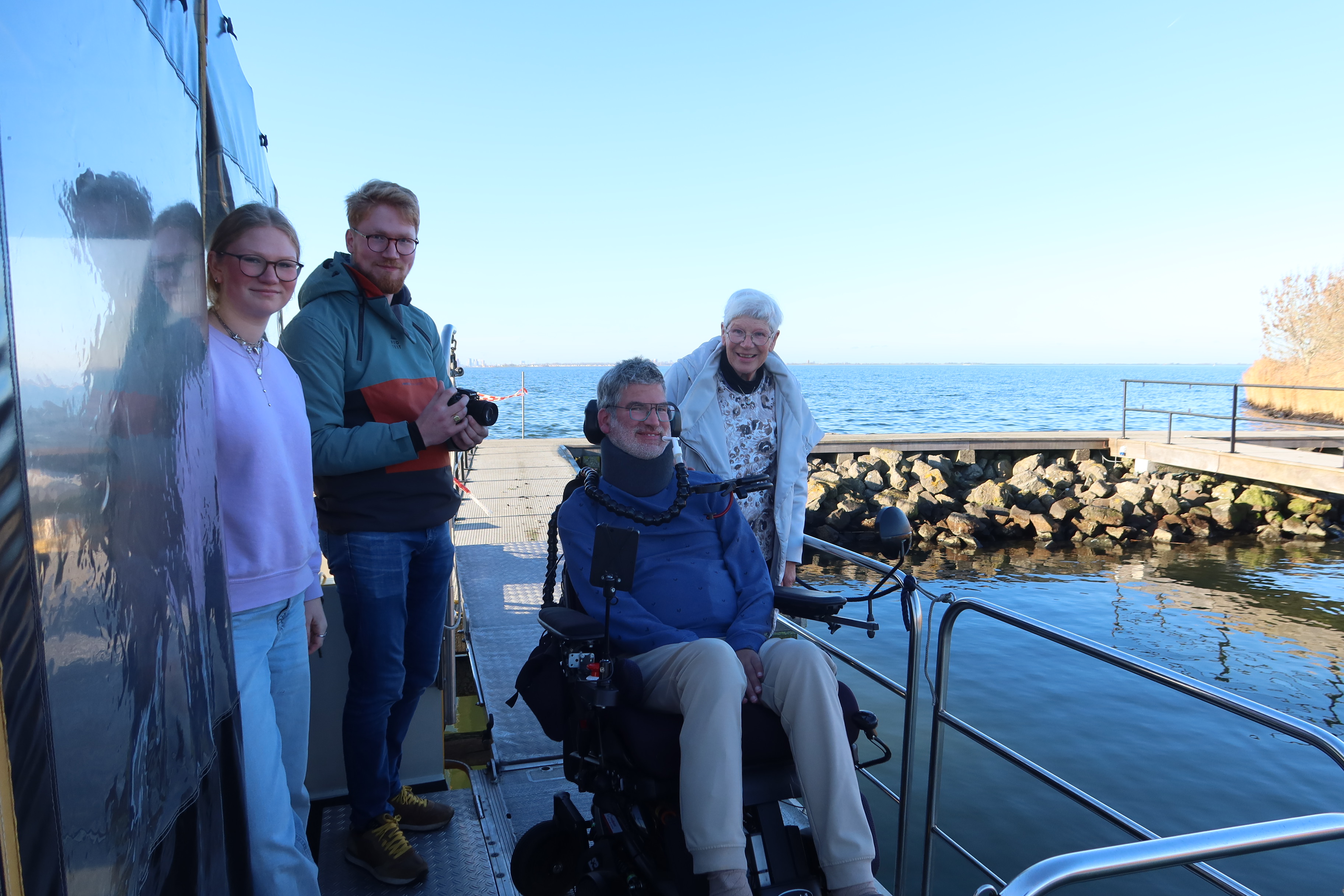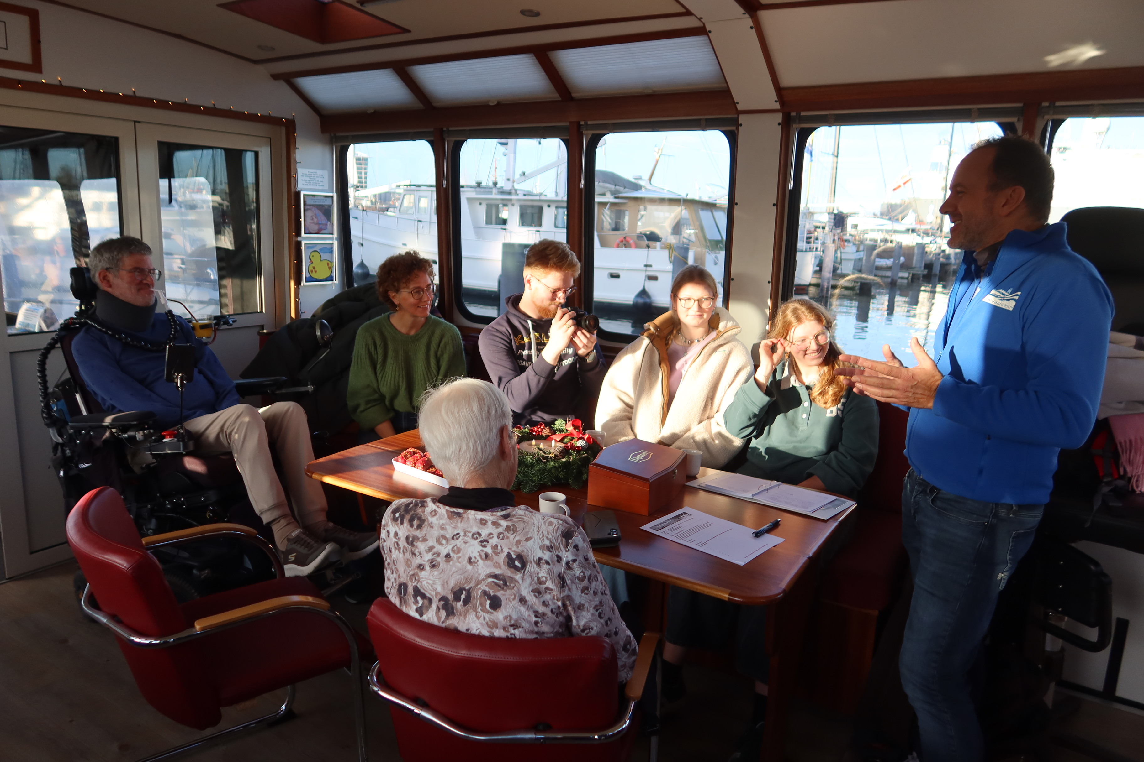 Op deze prachtige, kraakheldere decemberdag arriveerde de aangepaste bus bij de steiger. Geert werd omringd door zijn gezin, bestaande uit zijn vrouw Barbara en zijn drie kinderen: Kars, Naomi en Emma. Ook Geerts moeder Lies was van de partij. Een bijzondere rol was vandaag weggelegd voor Kars. Hij volgt een opleiding tot cameraman en filmde voor de documentaireserie van de ALS Vereniging: ‘ALS alles anders wordt’. En omdat de vaste documentairemaker niet mee was, nam hij de honneurs waar. Voor de documentaire interviewde Kars de bemanning en legde vast hoe het gezin deze dag beleefde. Een prachtige en persoonlijke manier om deze herinneringen te vereeuwigen.