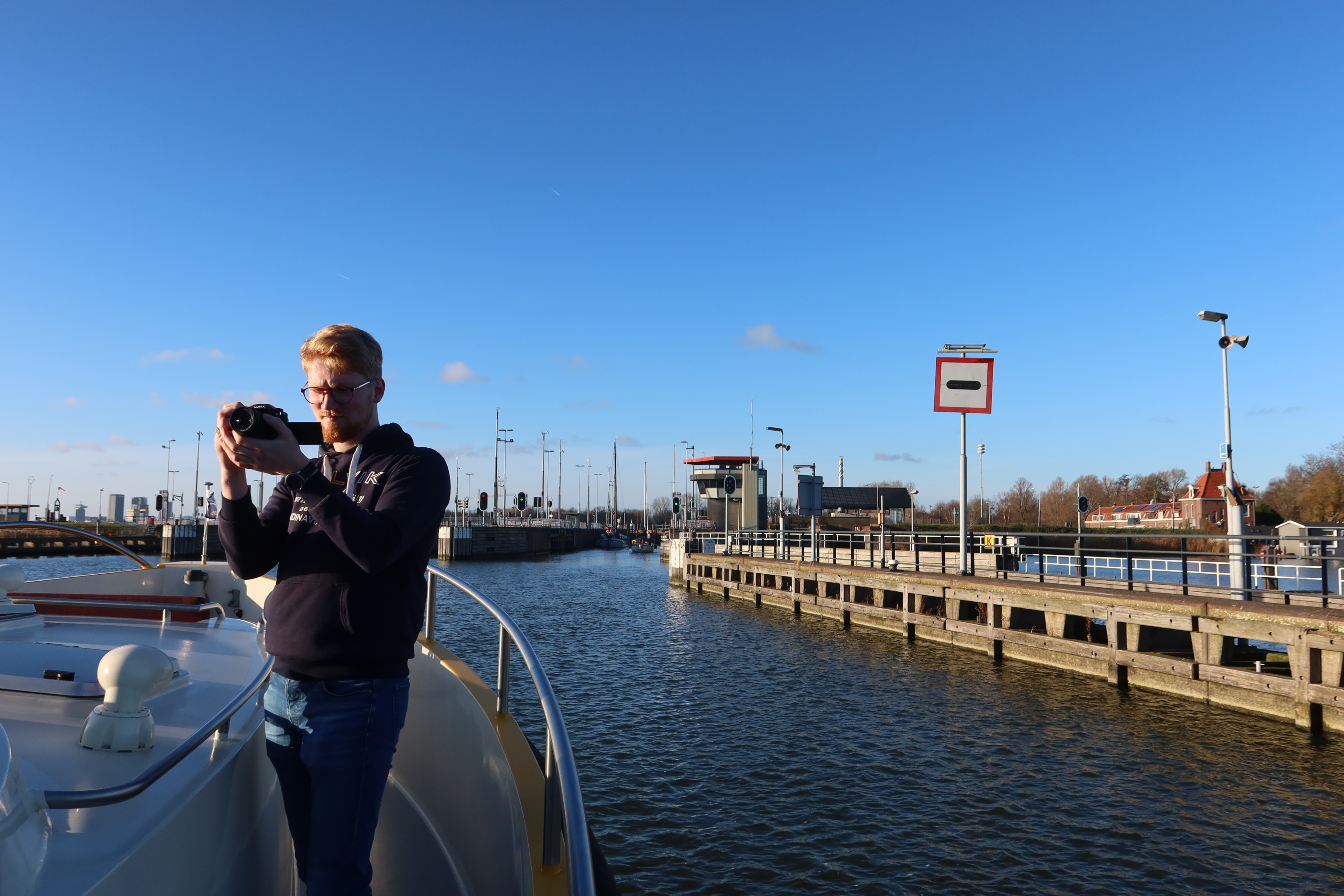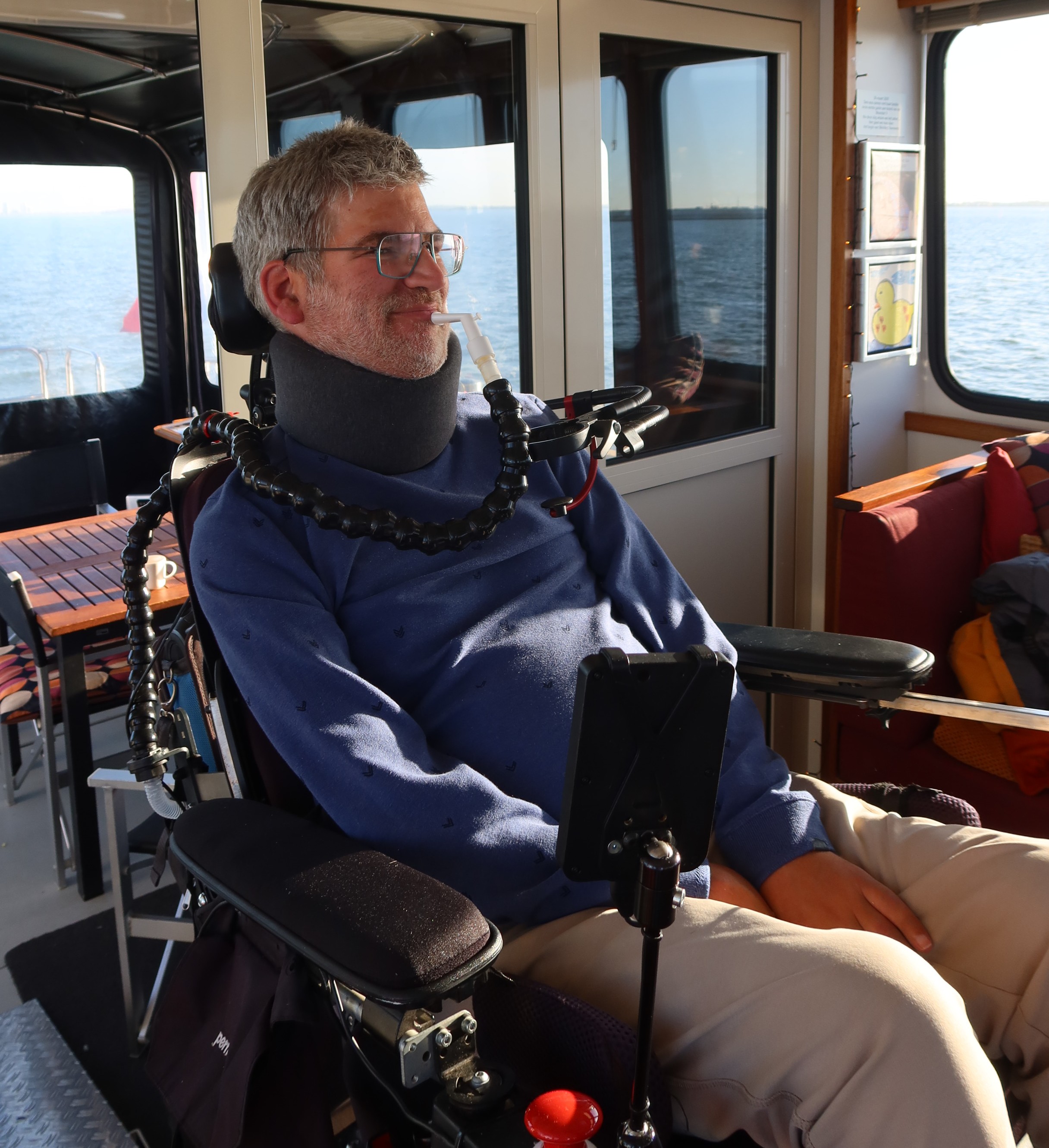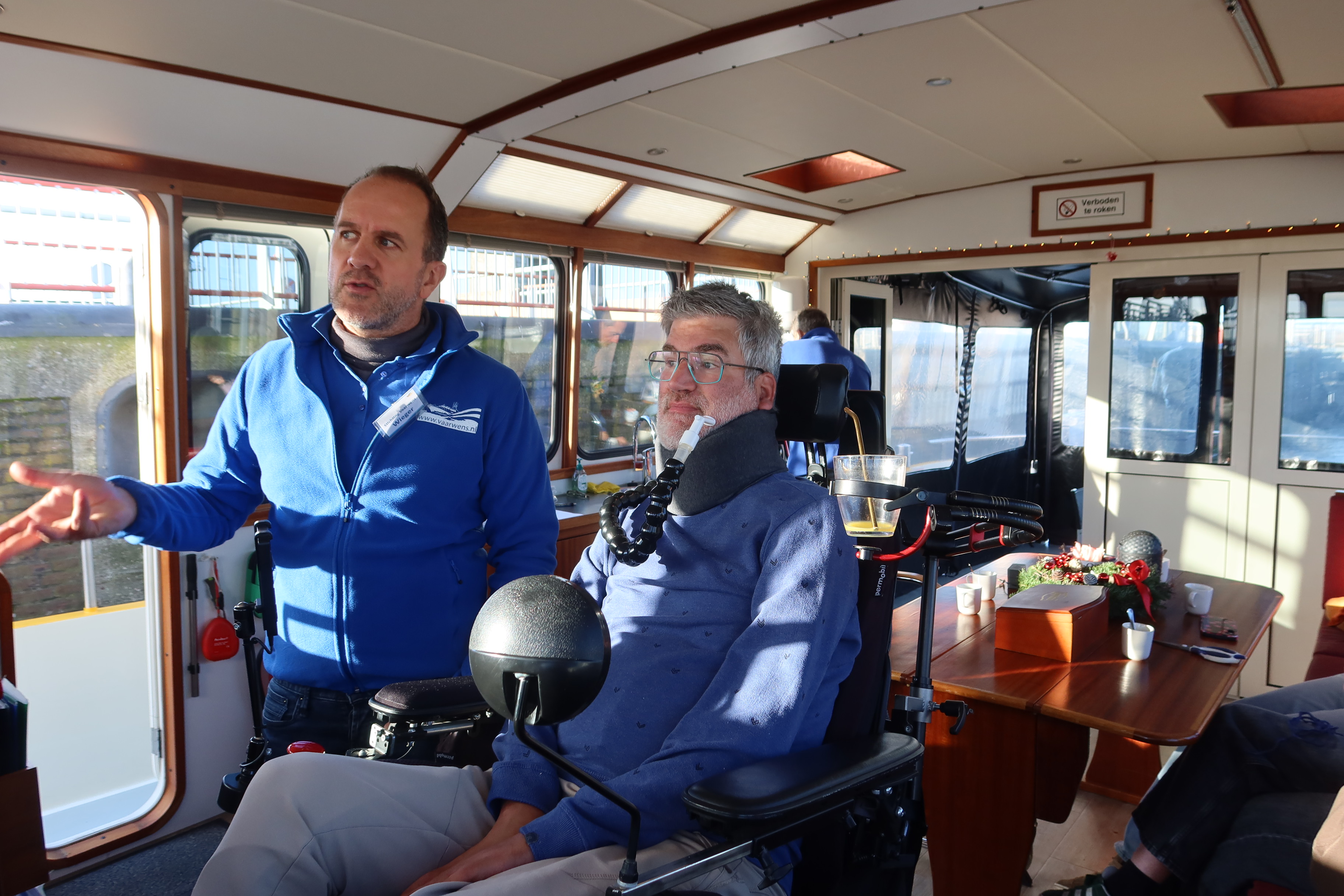 Op deze prachtige, kraakheldere decemberdag arriveerde de aangepaste bus bij de steiger. Geert werd omringd door zijn gezin, bestaande uit zijn vrouw Barbara en zijn drie kinderen: Kars, Naomi en Emma. Ook Geerts moeder Lies was van de partij. Een bijzondere rol was vandaag weggelegd voor Kars. Hij volgt een opleiding tot cameraman en filmde voor de documentaireserie van de ALS Vereniging: ‘ALS alles anders wordt’. En omdat de vaste documentairemaker niet mee was, nam hij de honneurs waar. Voor de documentaire interviewde Kars de bemanning en legde vast hoe het gezin deze dag beleefde. Een prachtige en persoonlijke manier om deze herinneringen te vereeuwigen.