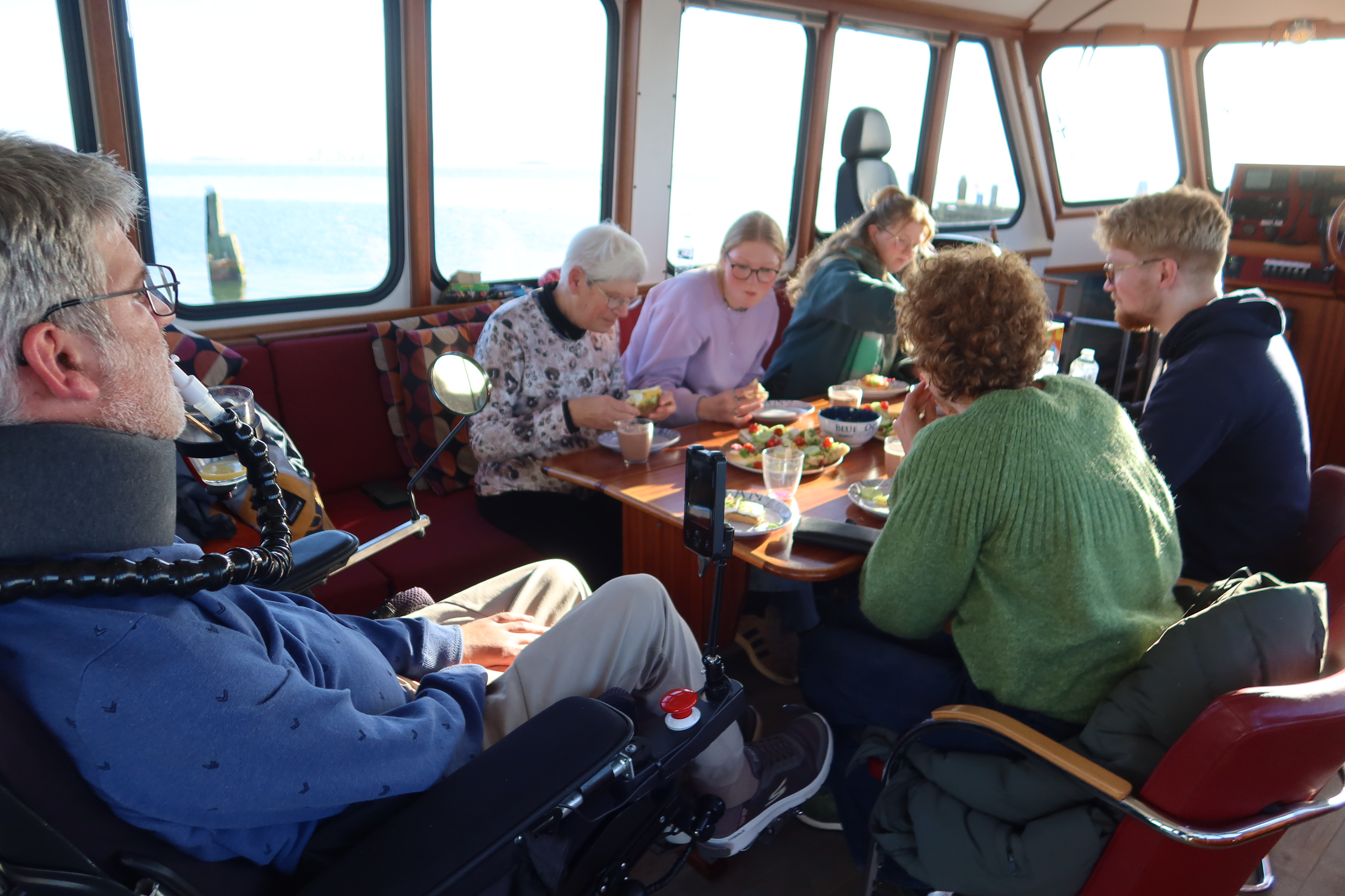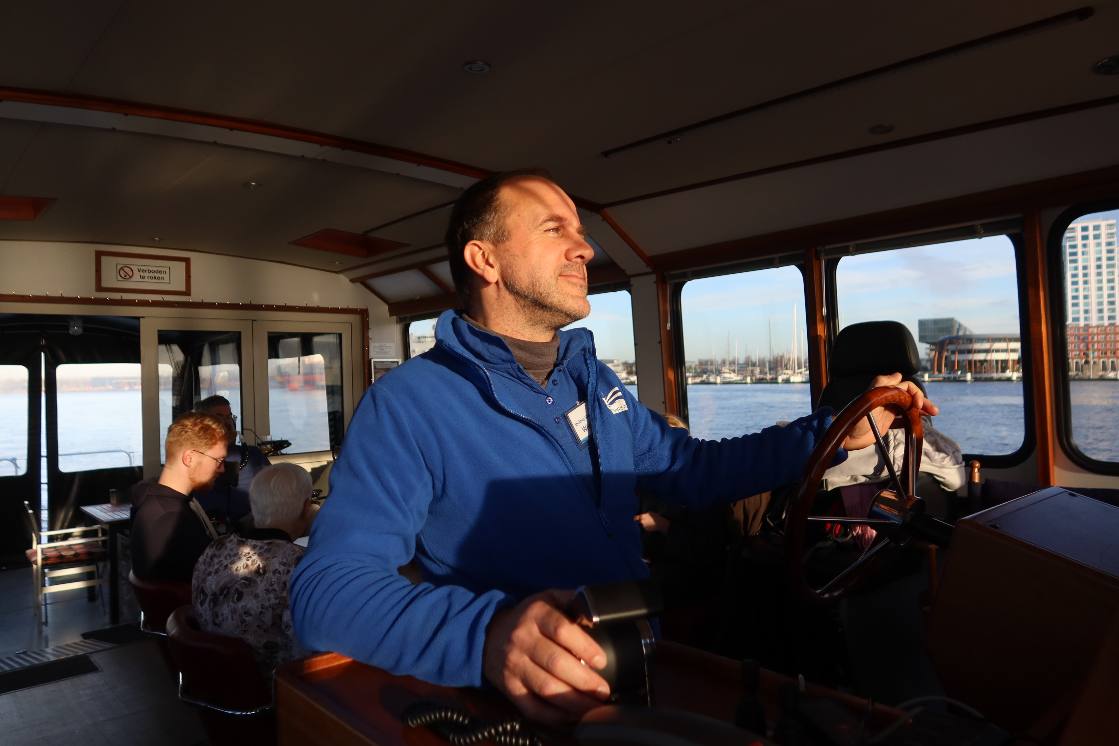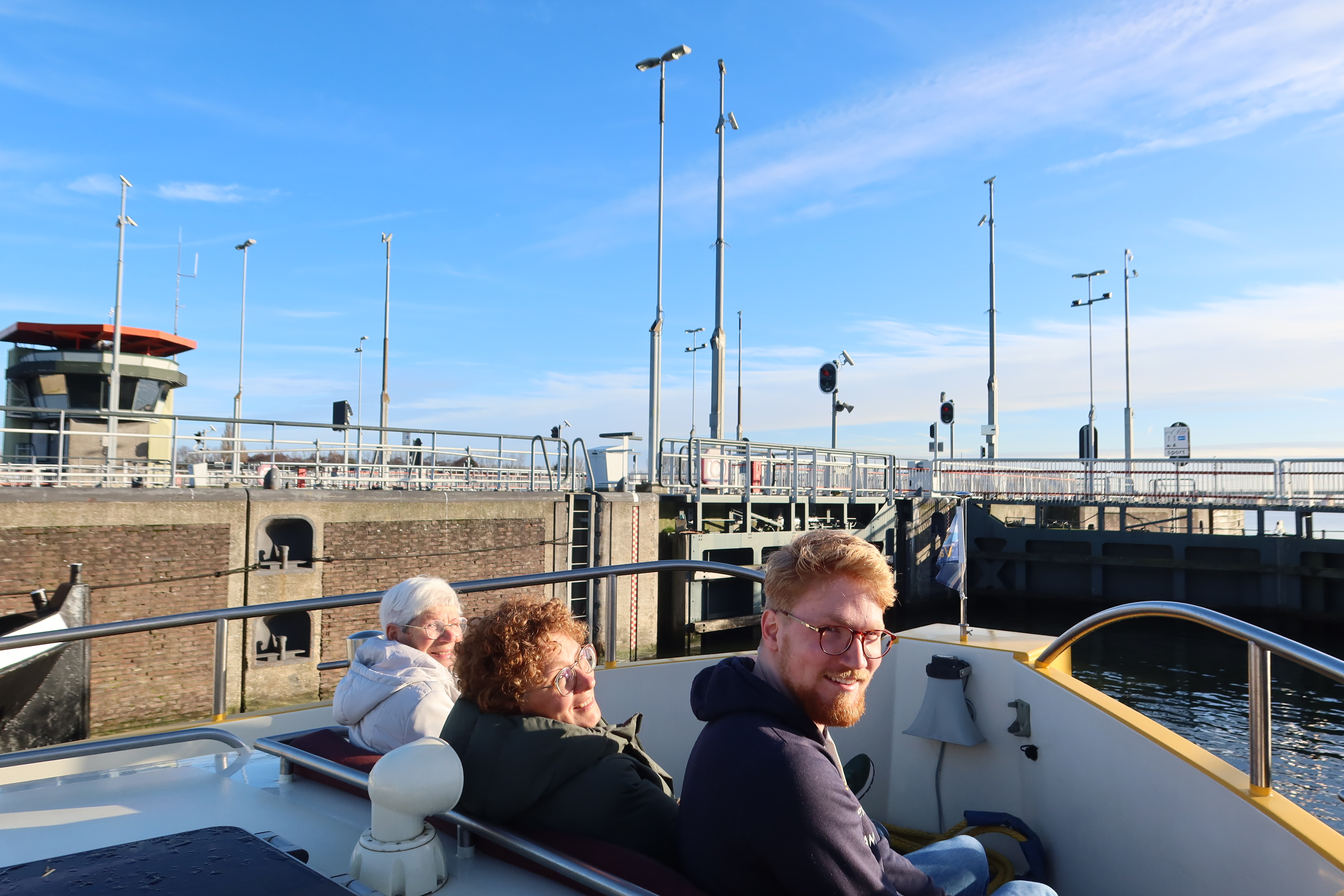 De aanvraag voor deze vaardag was gedaan door Geerts vriend Diederick, zelf een watersporter en bekend met onze stichting. Hoewel het gezin zichzelf omschreef als "niet echt watersporters" en ze blanco de dag in stapten, was de verrassing groot. Een beetje onwennig en, zoals Barbara aan het einde van de dag eerlijk zei, een beetje gestrest over alle logistiek, stapten ze aan boord. Maar zodra de trossen los gingen, viel er een rust over het gezelschap. De stad toonde zich van haar mooiste kant in de winterzon. Voor het gezin was het een hele nieuwe ervaring om onze hoofdstad eens vanaf het water te zien, weg van de drukte, varend over het prachtige IJ. Ook dochters Naomi (student Pedagogisch Werk) en Emma (die in het voorlaatste jaar van de middelbare school zit) genoten zichtbaar van de dag, en namen zelfs even het roer in handen, net als hun Oma Lies, die ook een prachtig stuk zelf gevaren heeft. Ook Geert, die ondanks zijn ziekte nog lang heeft doorgewerkt in de ICT bij een GGZ-instelling, genoot met volle teugen. Zijn wereld is door de ziekte kleiner geworden en spreken is zijn belangrijkste communicatiemiddel; vandaag was er alle ruimte voor dat gesprek.