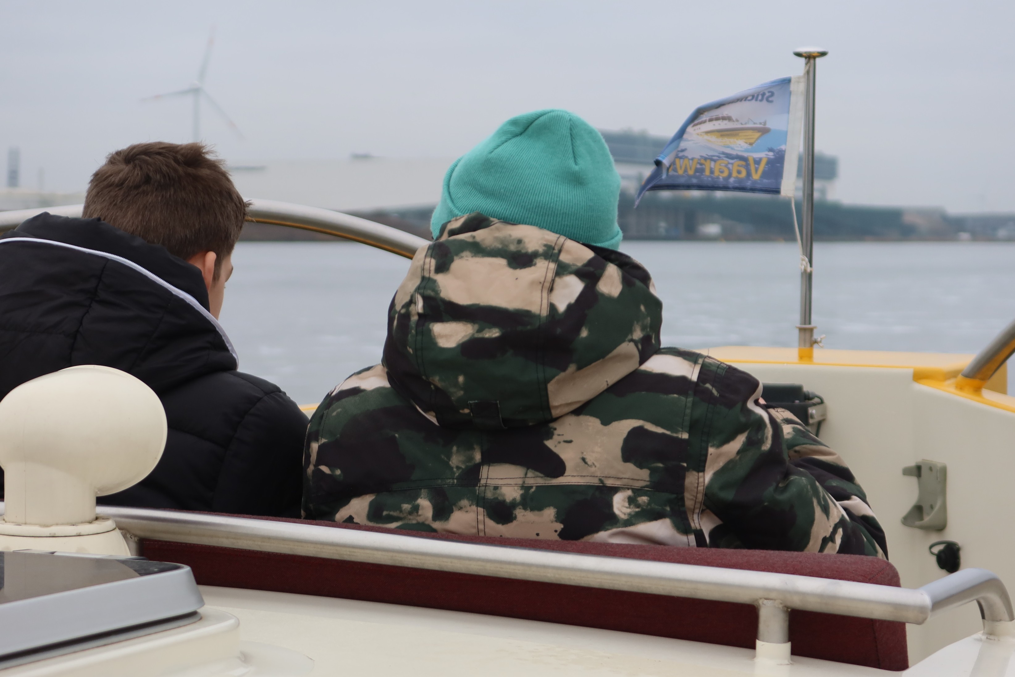 Natuurlijk haar man Marlon, haar schoonzusje Alexandra, haar zwager Michel, tante Marion, vriendin Cynthia, neef Levi en de belangrijkste, haar zoon Maiylow. Het is een gezellige groep mensen die onder leiding van Shirley zelf heel vrolijk aan boord komen. Het gezelschap is precies groot genoeg om lekker met z’n allen om de tafel te kunnen zitten in de kajuit. Dat is mooi want dan kunnen we daar met de koffie beginnen. De reis kwam vanaf Heerhugowaard, dus niet te lang, maar wel lang genoeg om trek in koffie te hebben. Marcel vertelt wat Stichting Vaarwens inhoudt en wat zij vandaag kunnen verwachten. Natuurlijk stelt hij beleefd voor om naar Pampus te varen, maar wanneer als alternatief De Zaanse Schans genoemd wordt is de keuze wel heel snel gemaakt. Ook een hele goede keuze want met dit weer is Pampus slechts een stipje in de verte en beleef je veel meer plezier aan de huisjes en de molens aan de Zaan. Overigens waren de soesjes en de tweede schaal koekjes snel op met twee pubers aan boord. Lekker hoor als je alles kunt eten zonder gevolgen op de weegschaal.