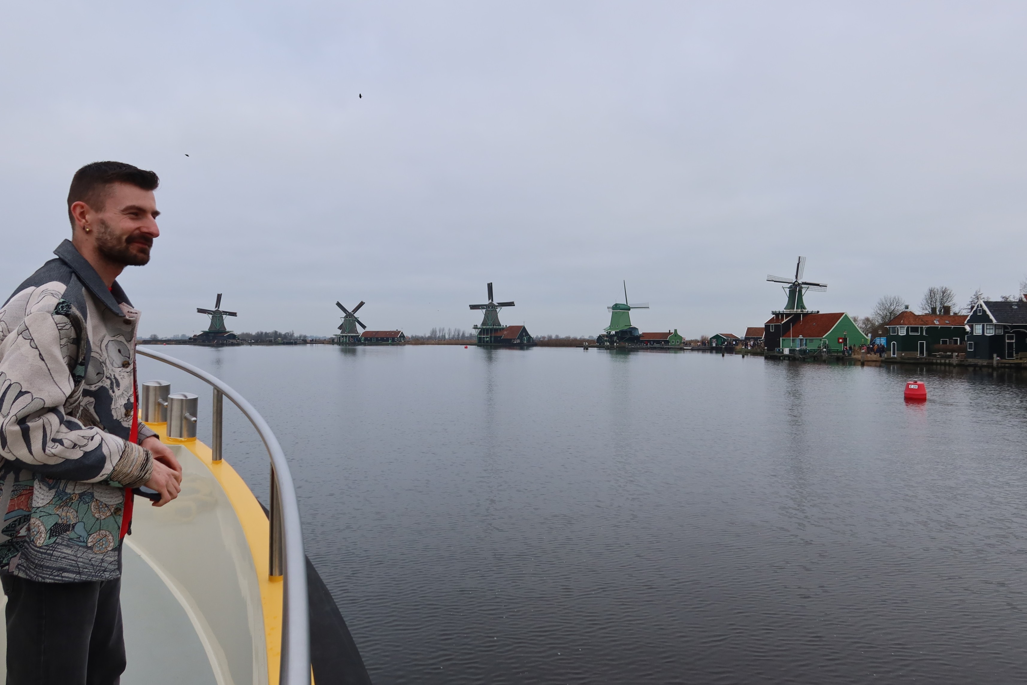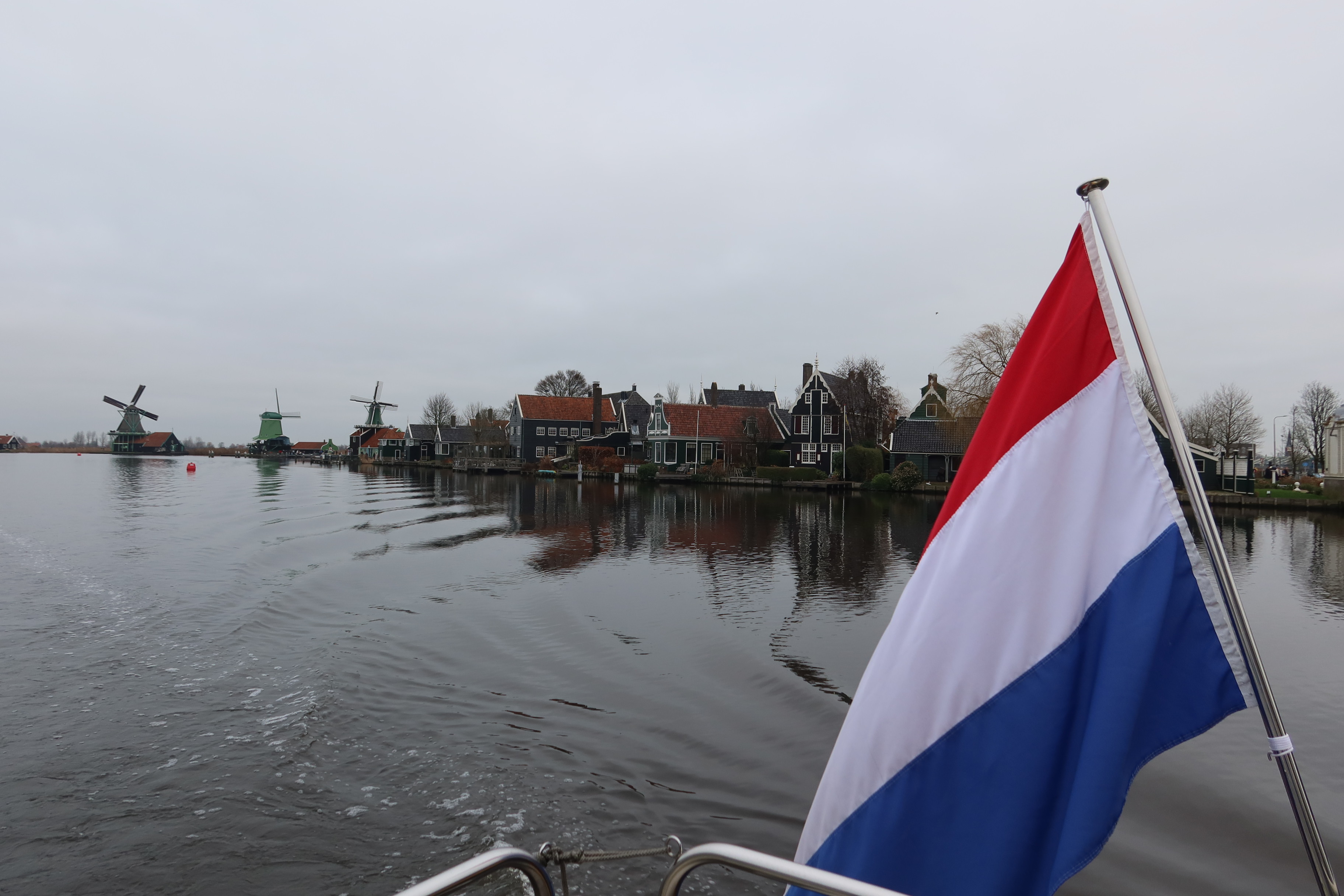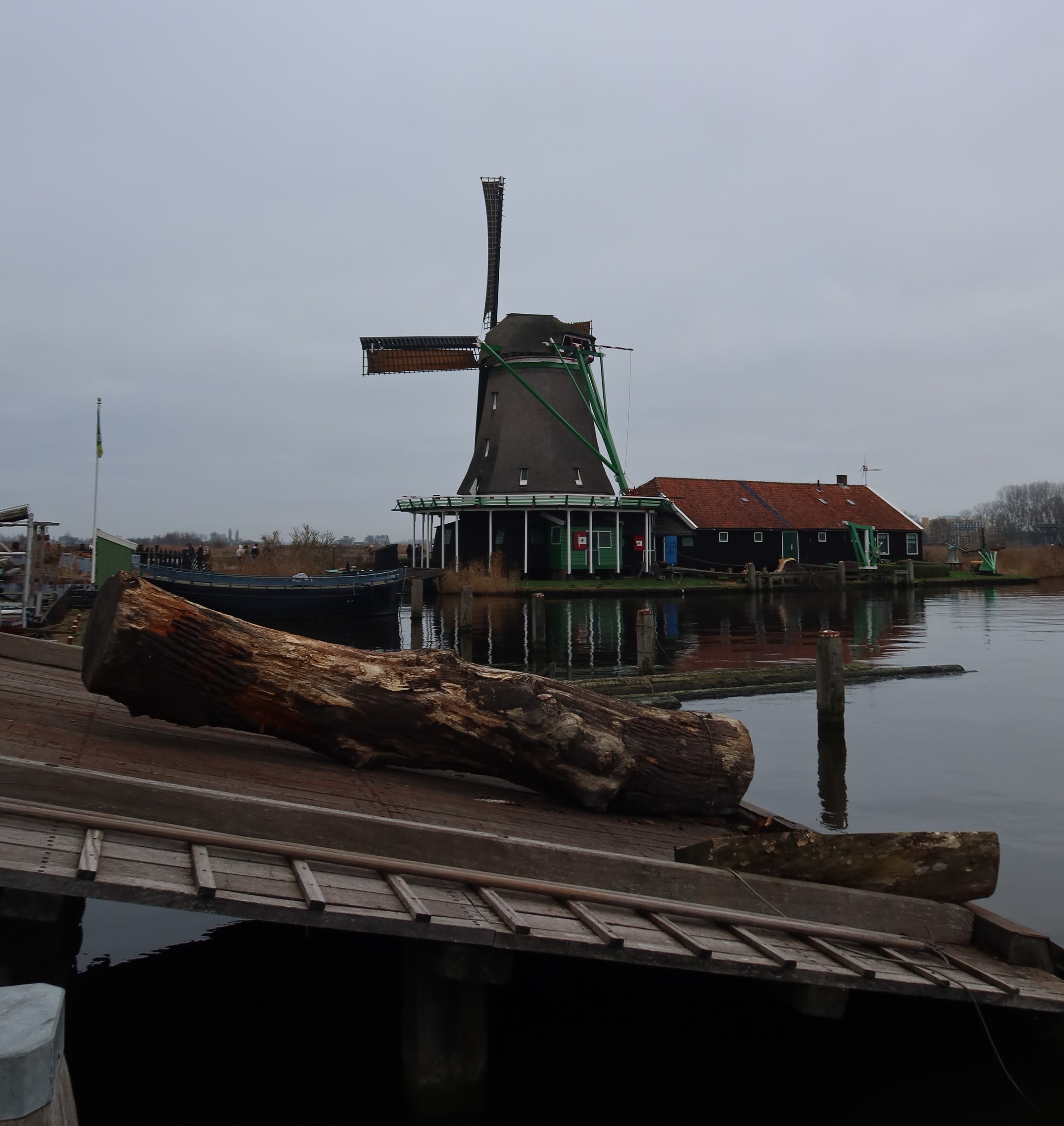 Ondertussen naderen wij de Wilhelminasluis in Zaandam. Met een wel hele vlotte schutting varen we de Zaan op. Genieten doen we van al die mooie huizen en de verhalen die daarbij horen. Soms komen we niet eens aan de verhalen toe, want de familie heeft het heerlijk samen en haalt herinneringen op aan leuke uitstapjes van de laatste tijd, met als hoogtepunt de Kerstmarkten in Duitsland. Na even wachten draait ook de spoorbrug en dan openbaart al gauw de Zaanse Schans zich. De molens allemaal onder zeil en ondanks weinig wind draaien zij toch. Altijd prachtig om te zien vooral vanaf het water. We worden hartelijk ontvangen aan de steiger van houtzaagmolen “t Jonge Schaap maar we besluiten toch om eerst even te lunchen.