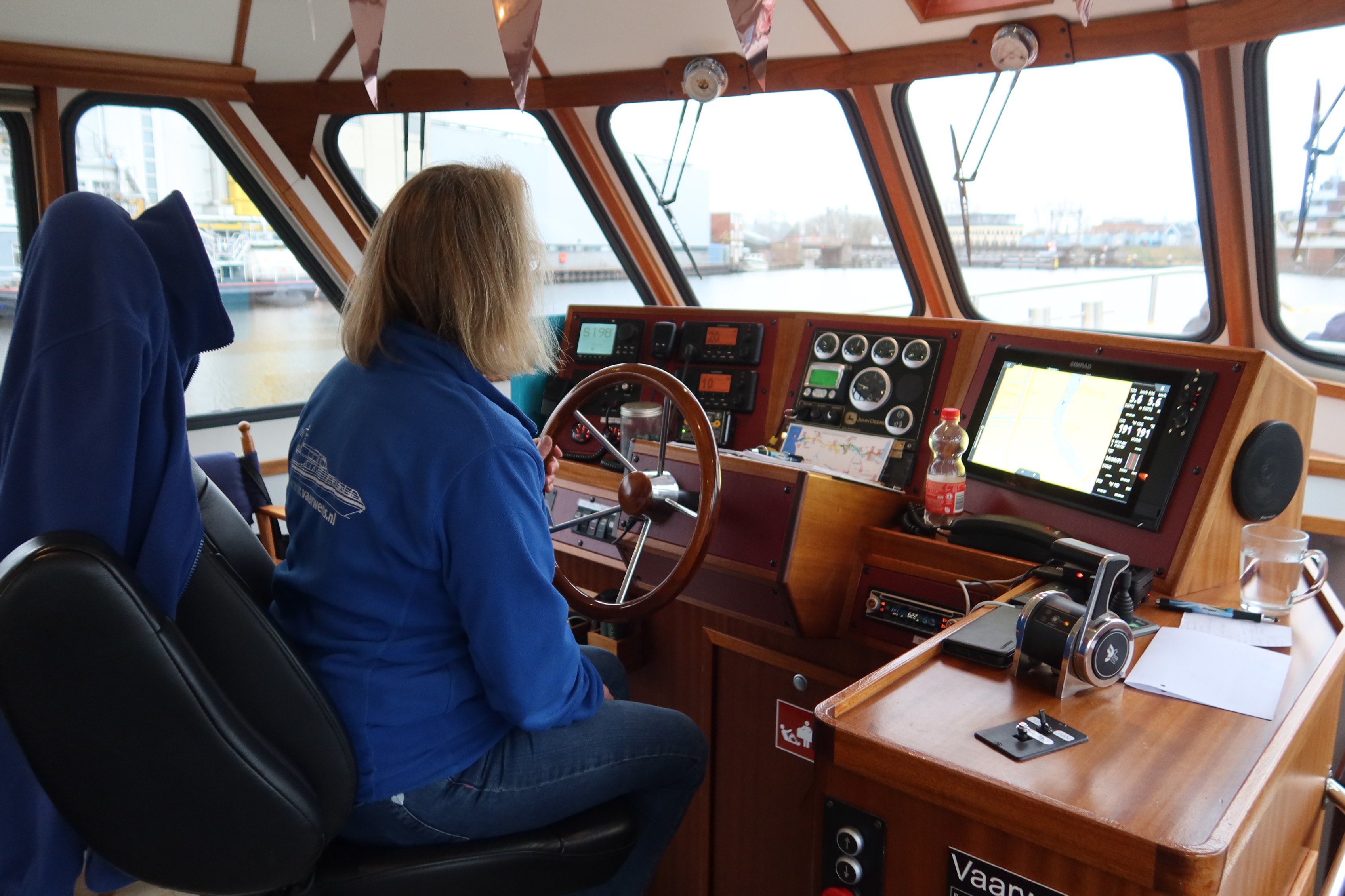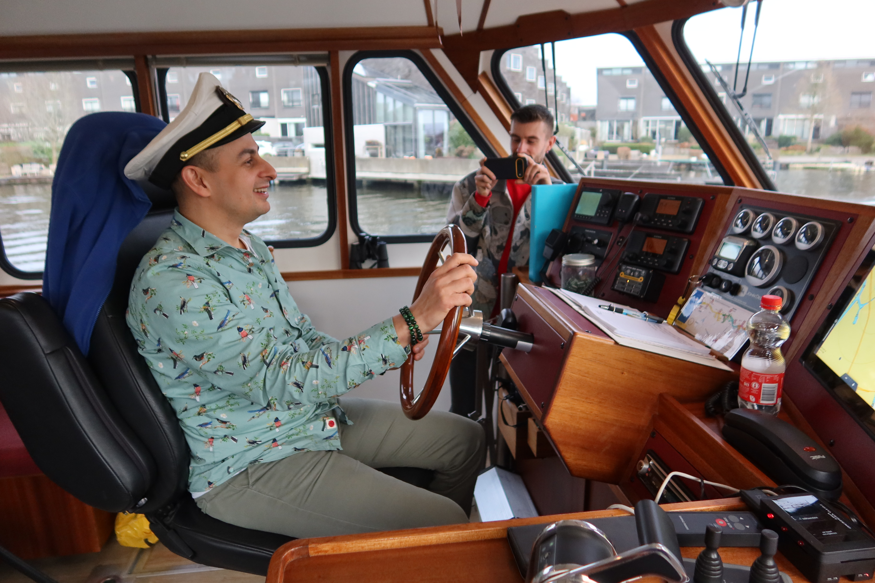 Alexandra heeft heerlijke cake gebakken voor bij de thee en dat is precies waar we trek in hebben, lekker een kopje warme thee met een plak cake. Ondertussen varen we weer richting Amsterdam. Wijnie aan het roer, als dat maar goed gaat. Na de sluis wilde eigenlijk de hele familie wel aan het roer. De ene serieus varend, de andere vooral voor de foto. Maar het bleek als snel dat de kapiteinspet iedereen wel heel goed stond.