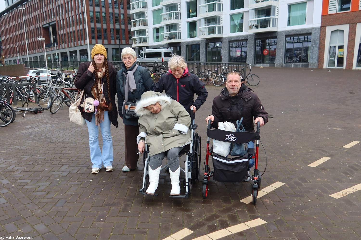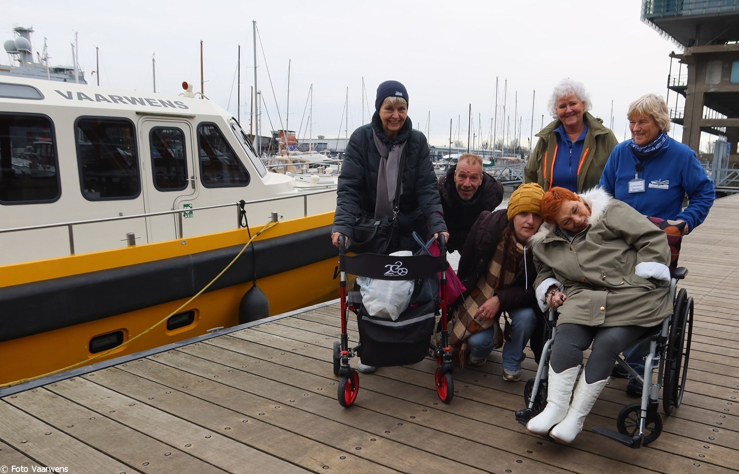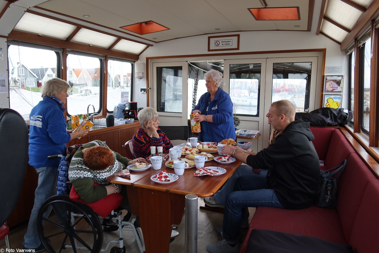Koud half tien gaat de boord telefoon en ietwat haperend komt de stem van Lucy vrolijk melden dat ze er al over 2 minuutjes zullen zijn! Gelukkig zie ik bootsen Nienke en Marleen aan komen lopen; zij hebben nauwelijks voet aan boord kunnen zetten, we trekken met vereende krachten de rolstoel en een fijn kussen uit het achterruim, ik druk Nienke nog net de fotocamera in de hand, want op de hoek zijn onze gasten al door de Valys taxi afgeleverd! Aan boord zet ik wat stoelen klaar, beuntje voor de deur, pak sleutels voor de lift en dan stapt iedereen al aan boord, Beppie in de rolstoel en buurvrouw Marga neemt haar rollator mee. Lucy en Rinus maken het gezelschap voor vandaag compleet. Een hartelijk weerzien voor Beppie en haar gezelschap met Frouk en Nienke en een nieuwe kennismaking met Marleen.