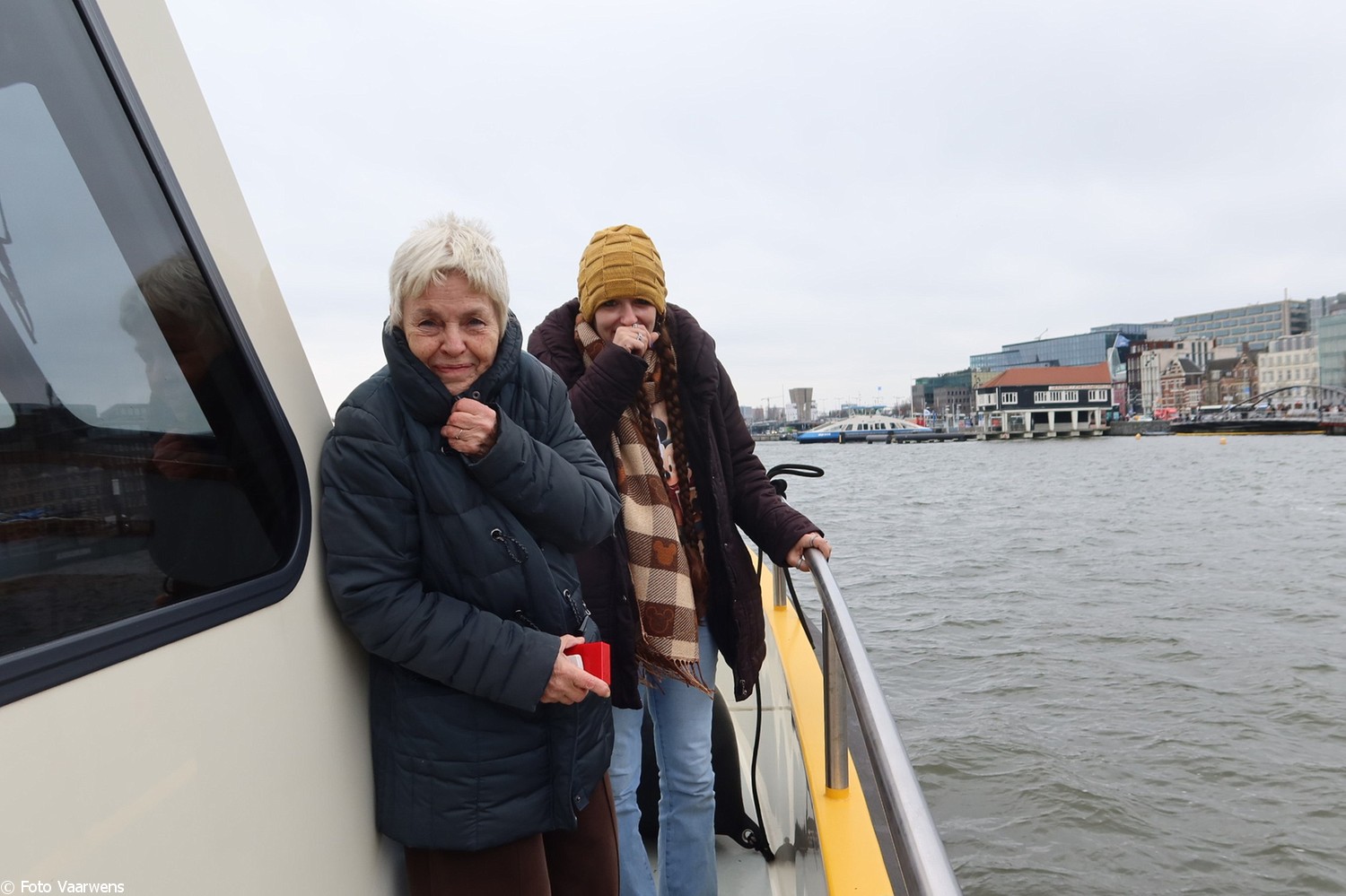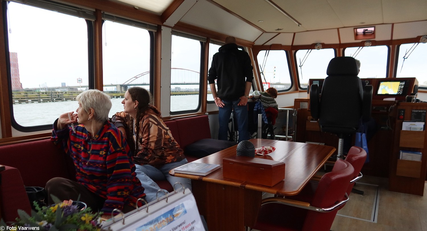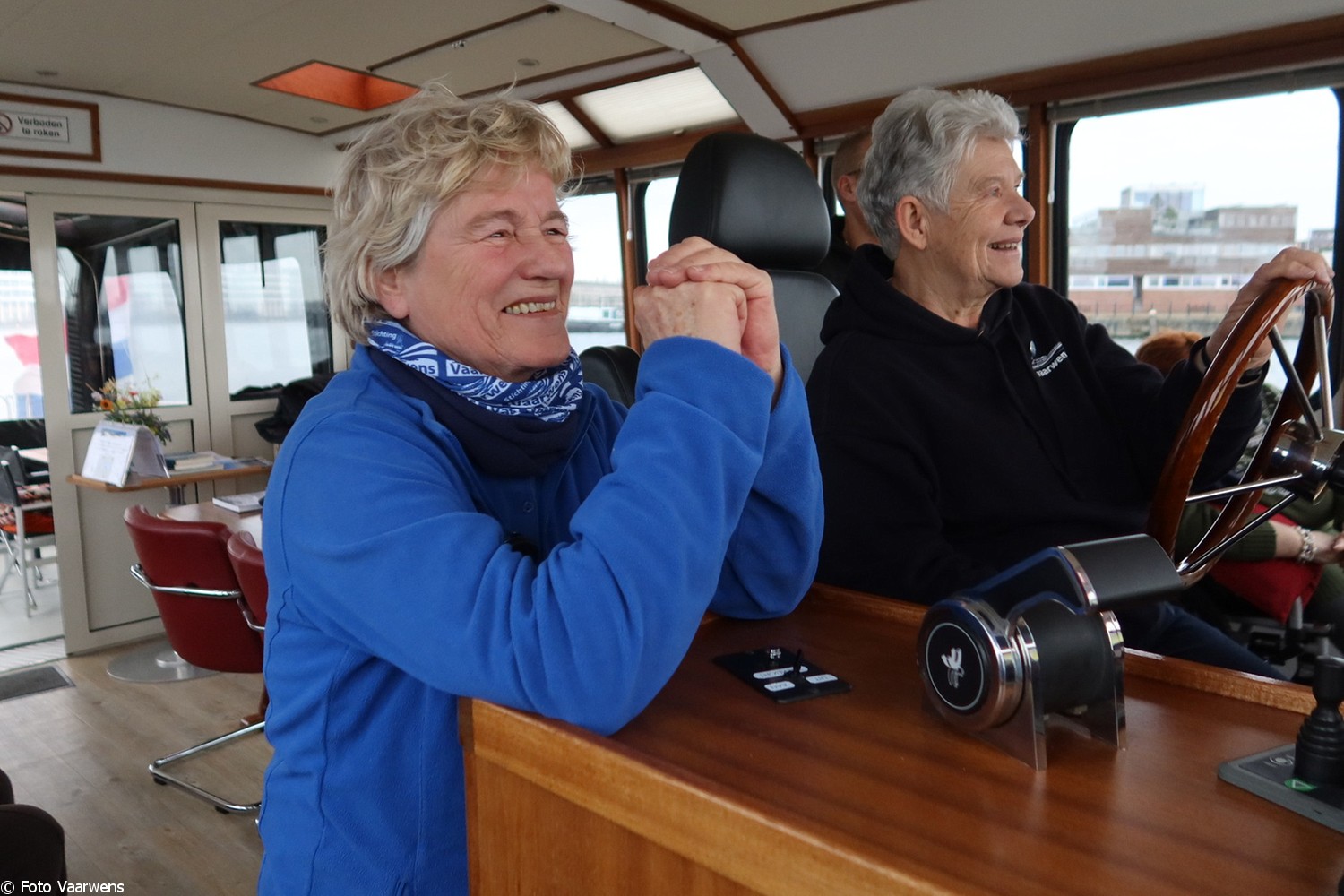 Koud half tien gaat de boord telefoon en ietwat haperend komt de stem van Lucy vrolijk melden dat ze er al over 2 minuutjes zullen zijn! Gelukkig zie ik bootsen Nienke en Marleen aan komen lopen; zij hebben nauwelijks voet aan boord kunnen zetten, we trekken met vereende krachten de rolstoel en een fijn kussen uit het achterruim, ik druk Nienke nog net de fotocamera in de hand, want op de hoek zijn onze gasten al door de Valys taxi afgeleverd! Aan boord zet ik wat stoelen klaar, beuntje voor de deur, pak sleutels voor de lift en dan stapt iedereen al aan boord, Beppie in de rolstoel en buurvrouw Marga neemt haar rollator mee. Lucy en Rinus maken het gezelschap voor vandaag compleet. Een hartelijk weerzien voor Beppie en haar gezelschap met Frouk en Nienke en een nieuwe kennismaking met Marleen.