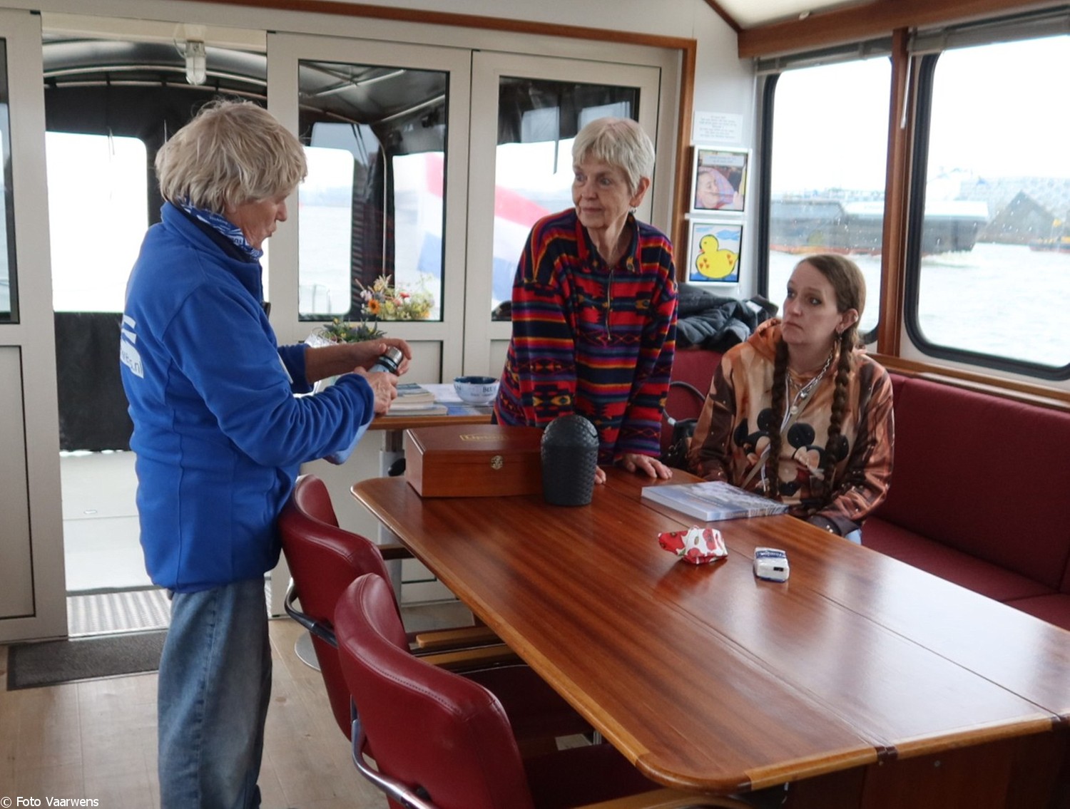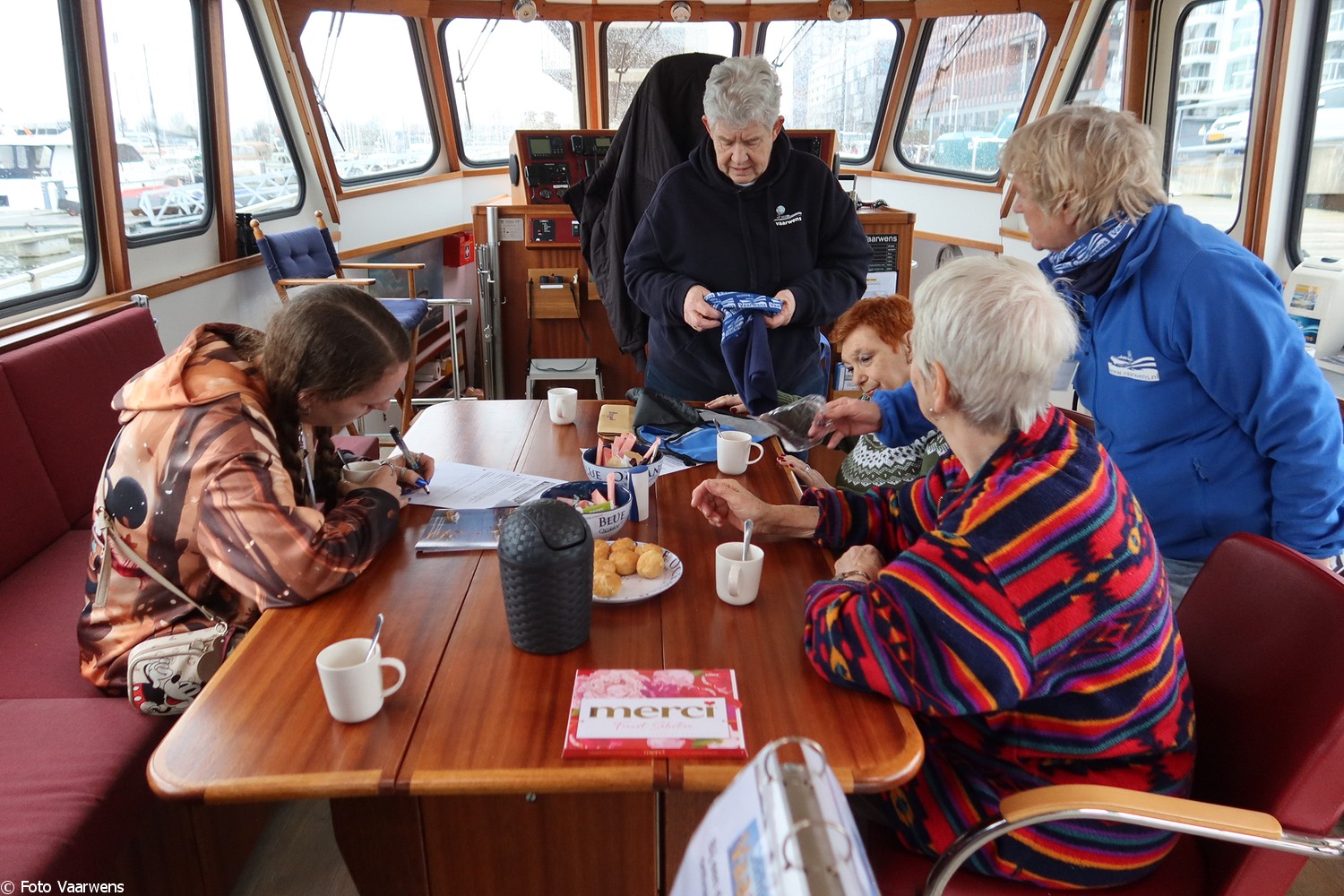 Intussen vliegen de flauwe opmerkingen en grappen al weer door de kajuit en de stemming zit er goed in. Na een goed kwartiertje is ms Vaarwens er klaar voor en zitten we aan een eerste bakje koffie (er zullen en nog heel wat volgen).