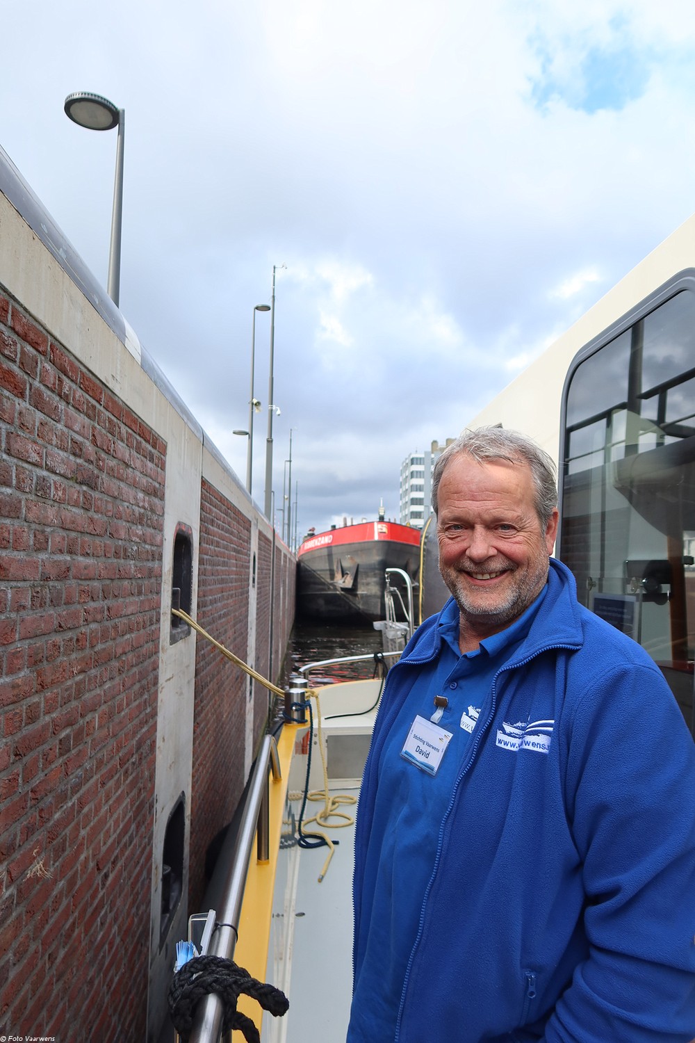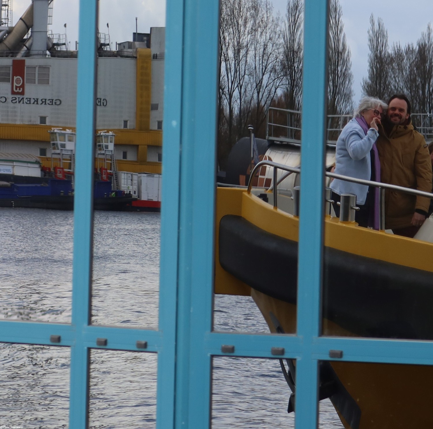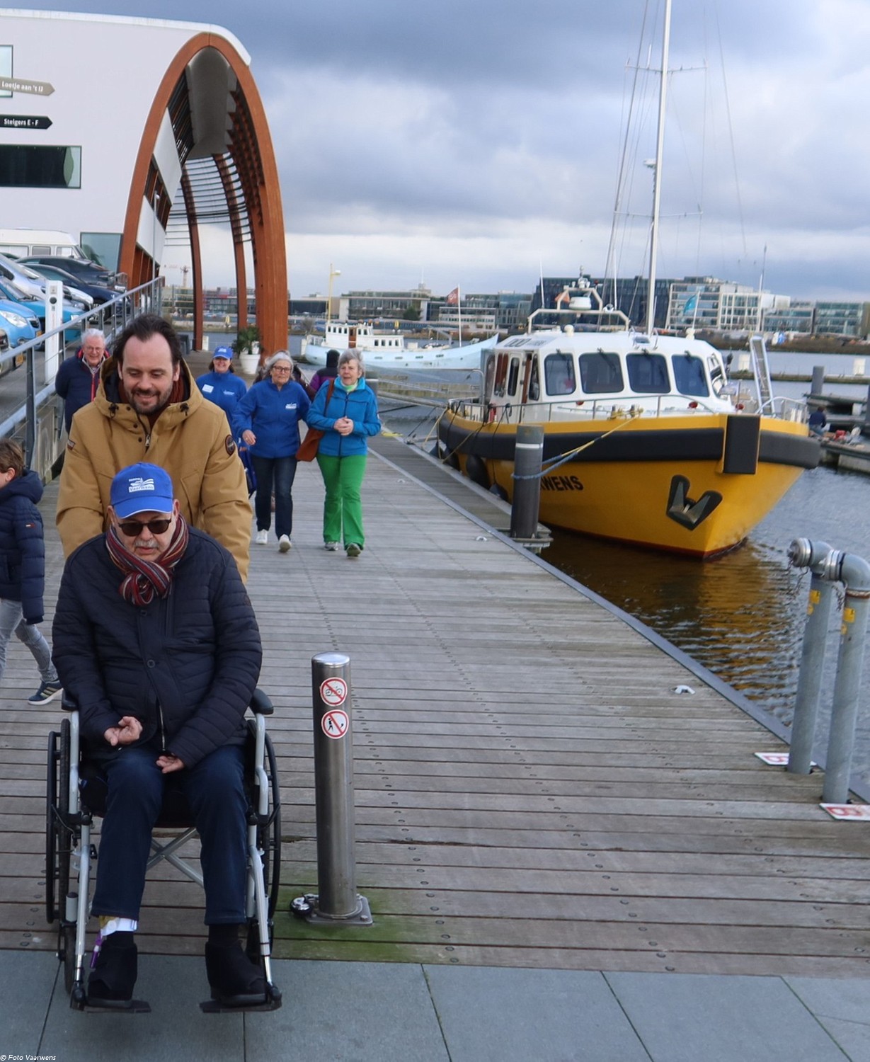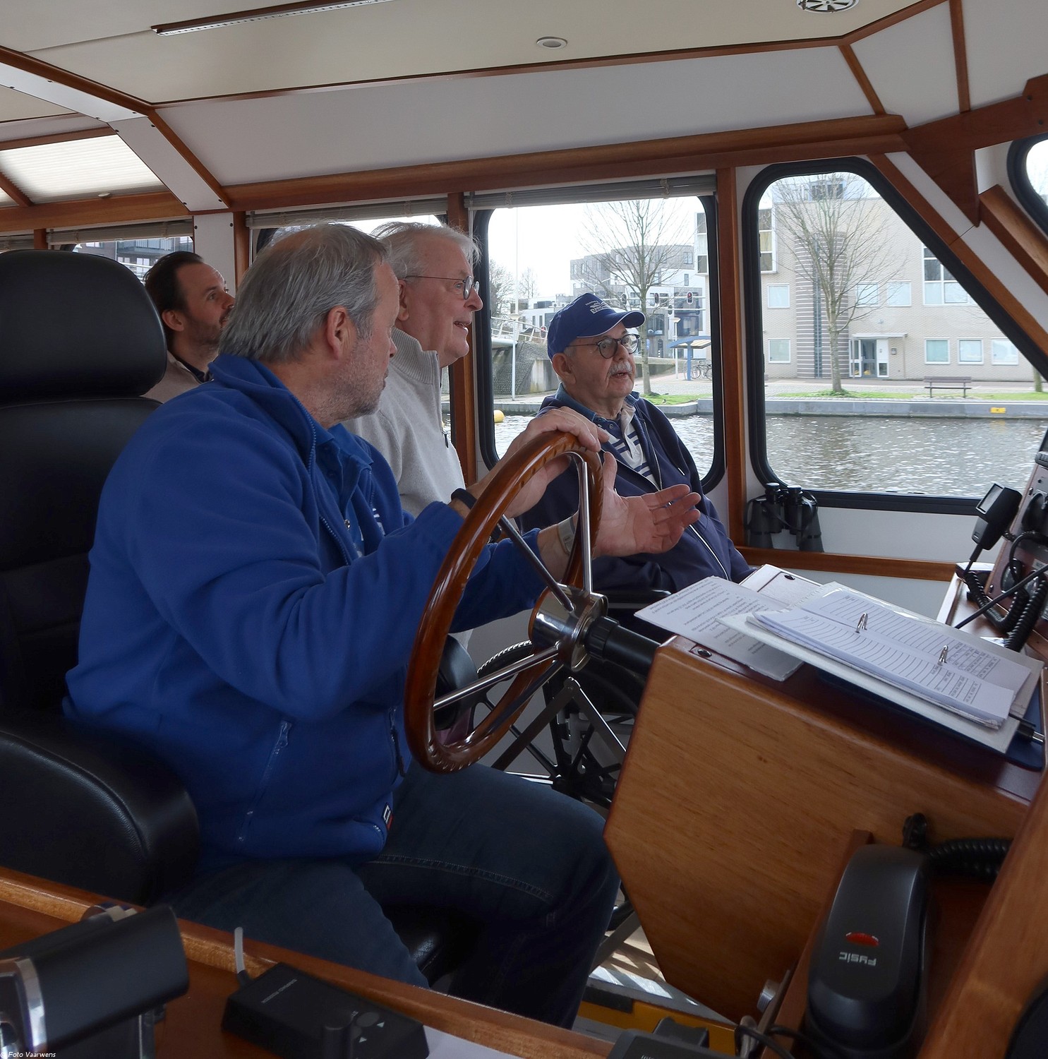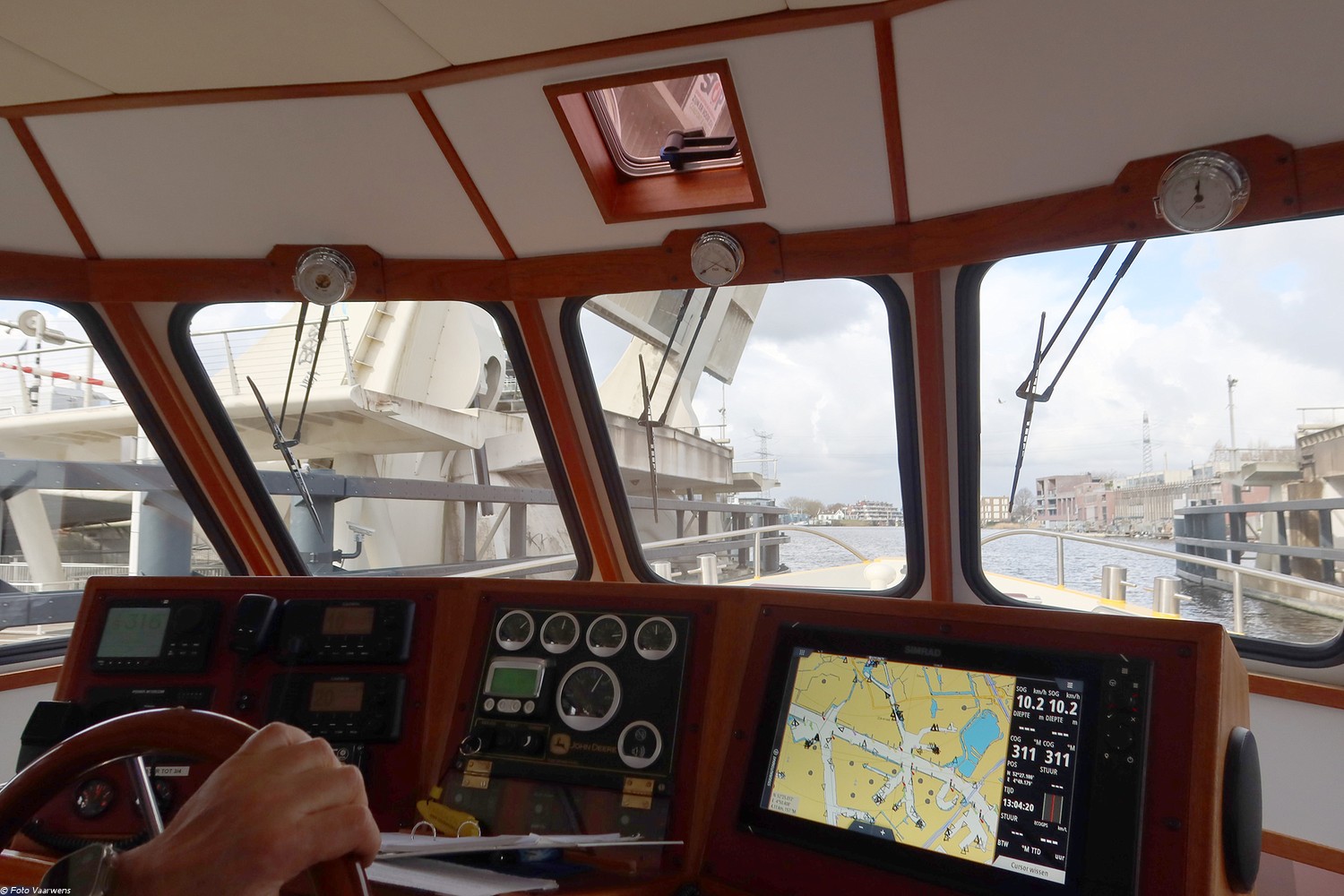 Dick neemt plaats naast schipper David. Dankzij de liftvloer kan hij vanuit zijn rolstoel prachtig over de boeg uitkijken. De plek naast de schipper geeft hem bovendien de gelegenheid vragen te stellen over de technische aspecten van het schip.