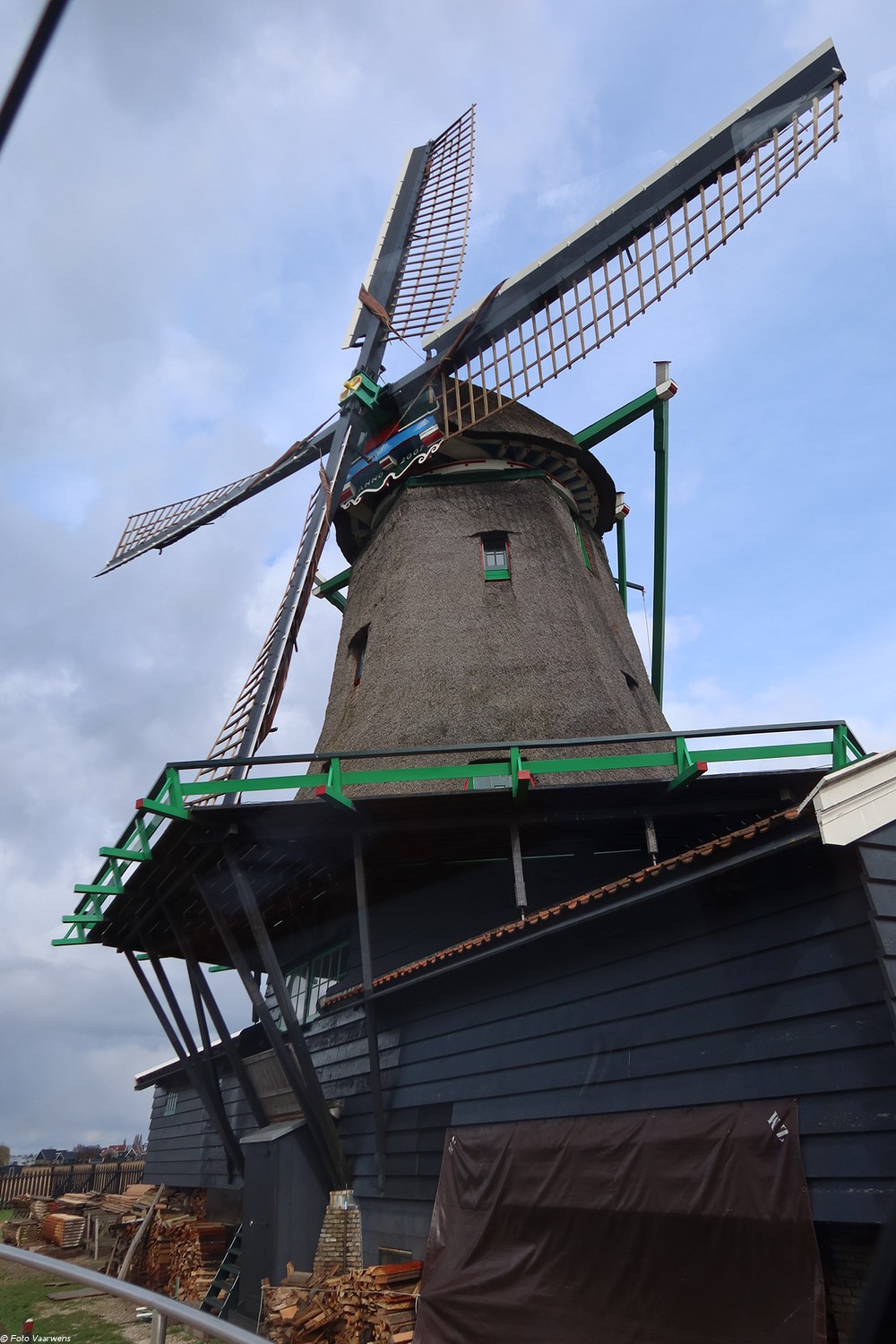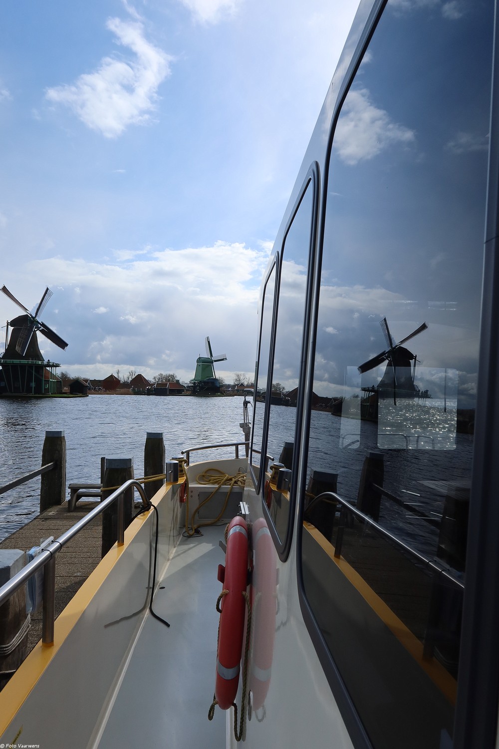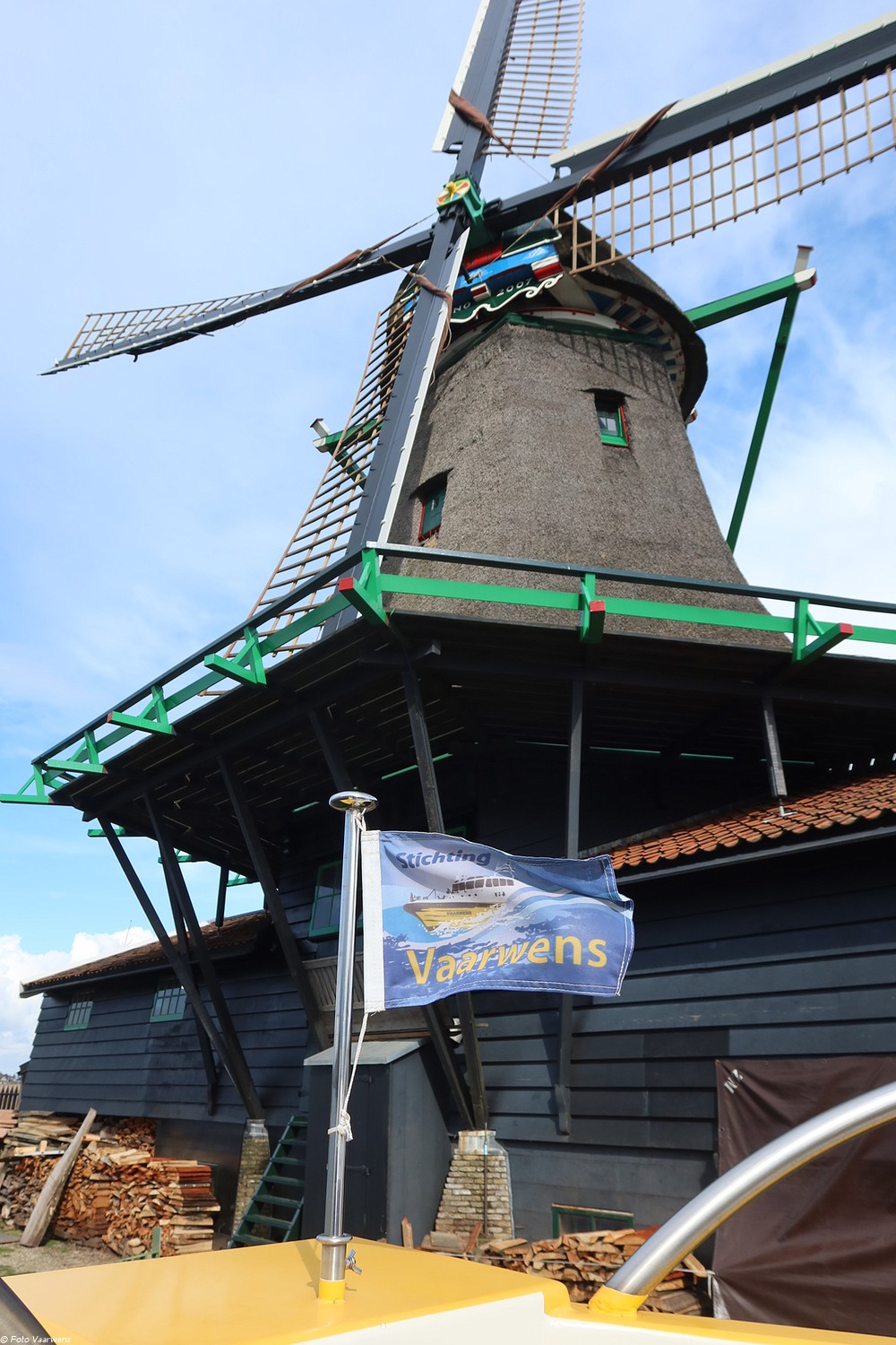 Tot onze verrassing staan de wieken van Houtzaagmolen Het Jonge Schaap stil wanneer we de bocht om varen; de molen is vandaag gesloten. Gelukkig draaien de andere molens wel, tegen een decor van dreigende Nederlandse wolkenluchten. Een prachtige plek om aan te leggen voor de lunch.