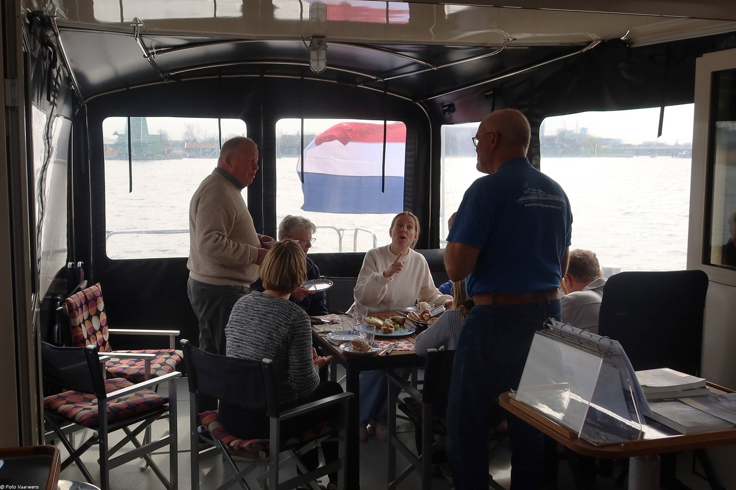 Bij de Zaanse Schans gingen van boord om de zaagmolen te bezoeken met uitleg. Bij terugkomst op de boot was de tafel gedekt met heerlijke belegde broodjes.