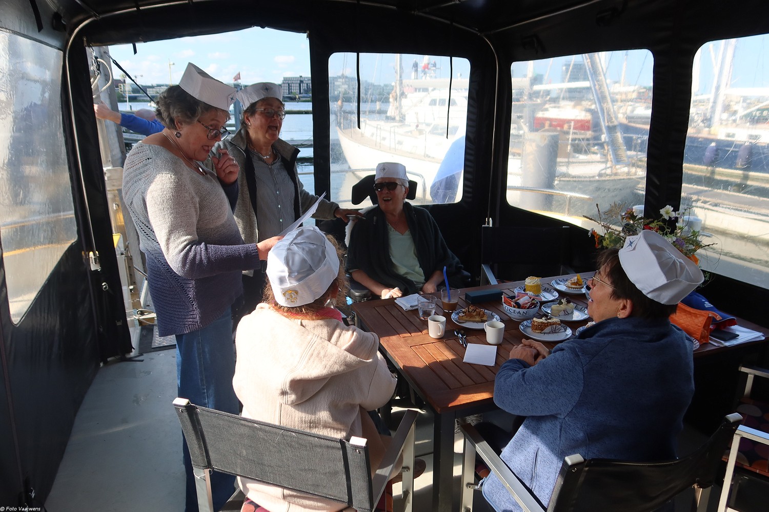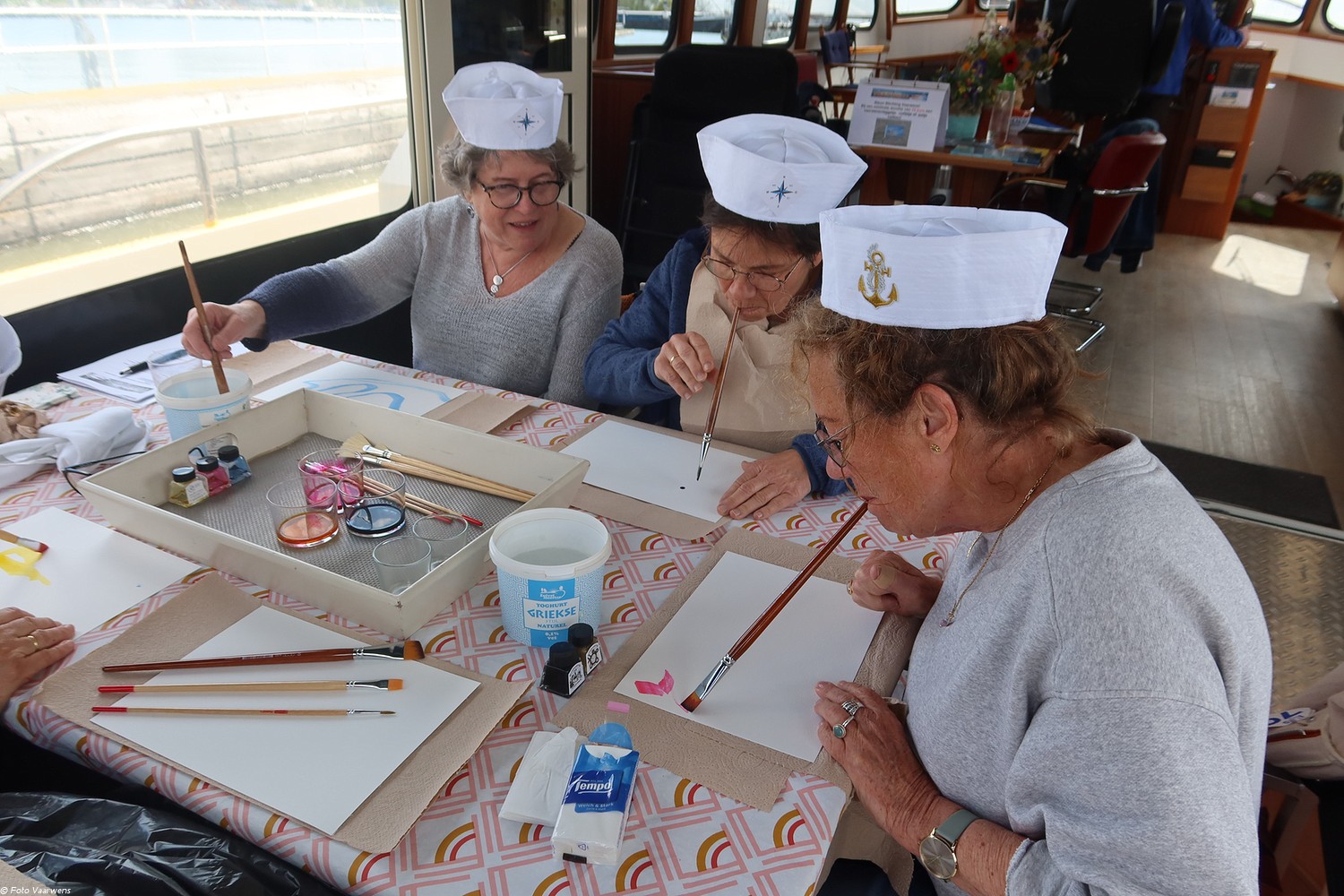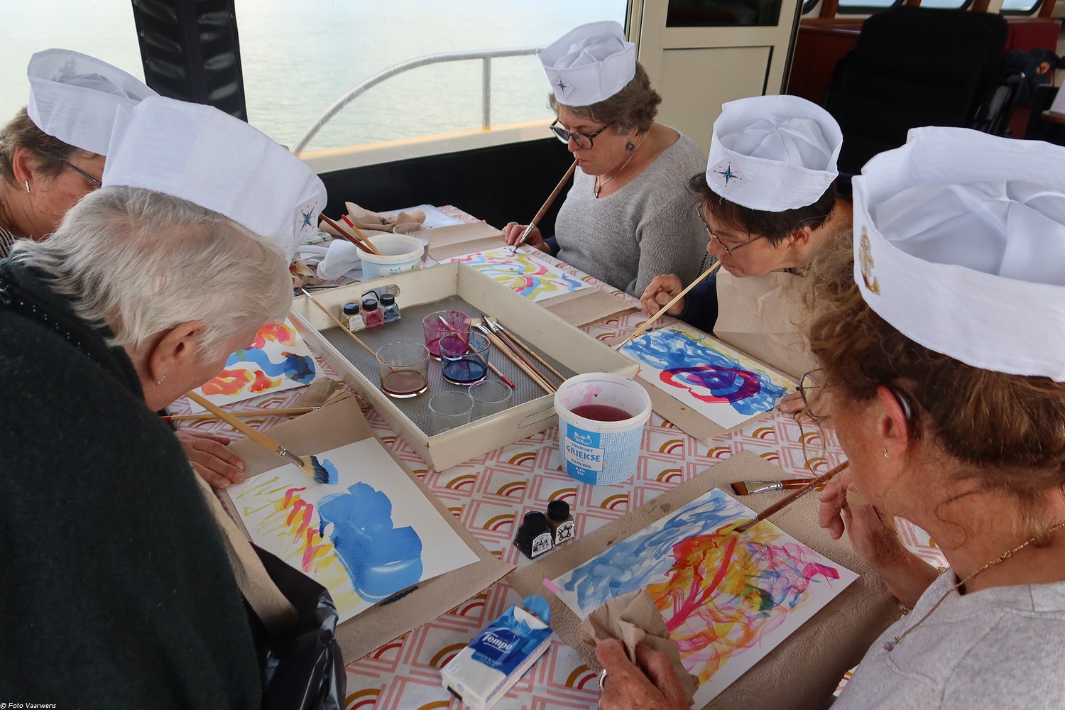 Het organiserend comité wilde de 70ste verjaardagen graag op de Vaarwens vieren. Dat hebben we geweten:-). Naast het gezelschap kwamen er veel volle tassen aan boord. Er bleek een heel programma opgesteld te zijn. Van twee dingen waren we op de hoogte: ze wilden graag naar Pampus en ze zouden gebak meenemen. De rest was ook voor ons een verrassing: En werden welkomstliedjes gezongen, matrozenpetjes uitgedeeld, er werd gemondschilderd, er werden canons gezongen, intussen wilden de dames ook nog graag bij Pampus aan de wal en hebben een korte rondleiding gekregen van een vrijwilliger op Pampus die toevallig ook de man is van een vrijwilliger, Anneke, bij de stichting Vaarwens. (Oké, zo toevallig was dat niet omdat wij van tevoren al met die vrijwilliger contact hadden gehad. Ons kent ons hè!) Er werden tegeltjes beschreven, er werd een collage gemaakt van de gemondschilderde kunstwerken. Intussen werden er Rotterdamse en Amsterdamse klassiekers/meezingers gespeeld. Wel met de vraag of het geluid wat harder mag, want het is achterin niet zo goed te horen.