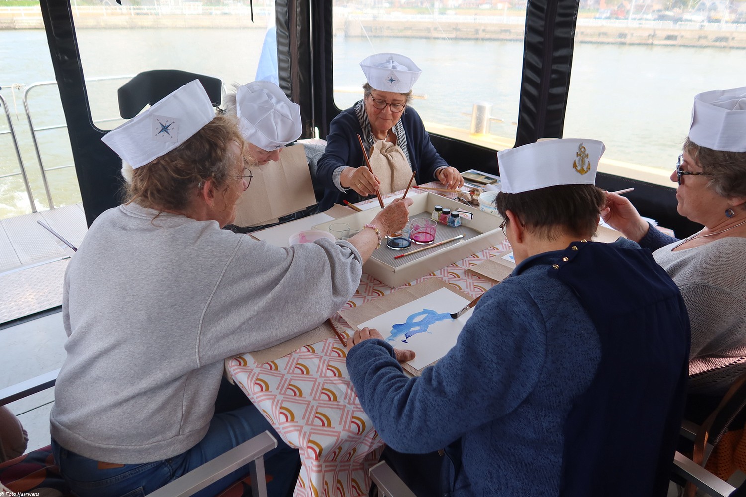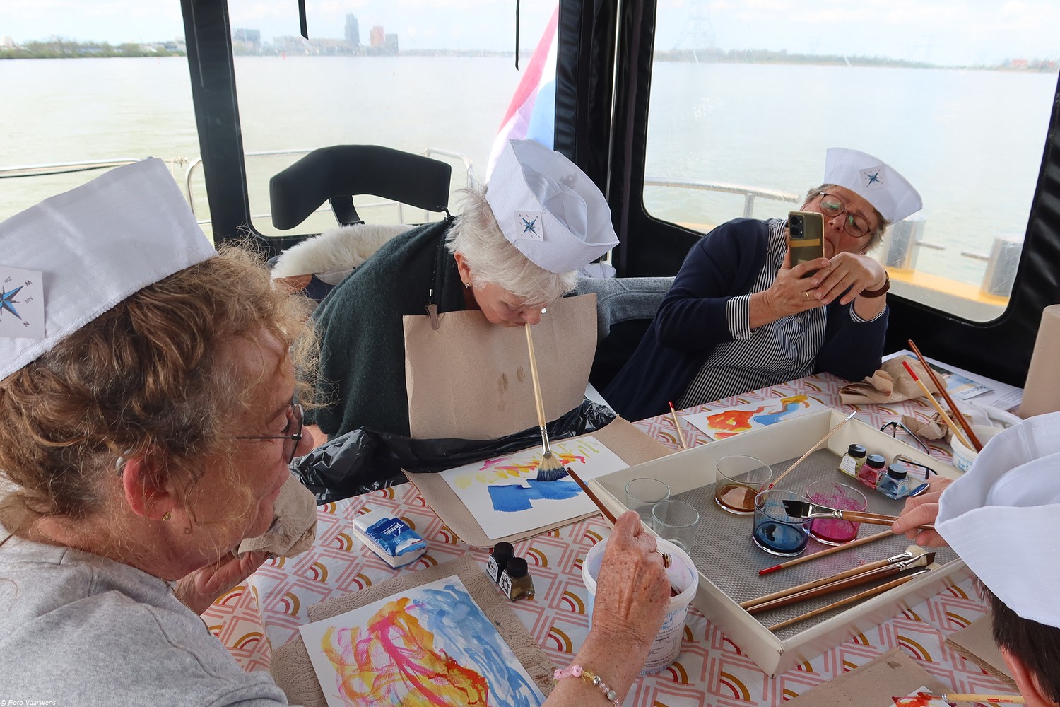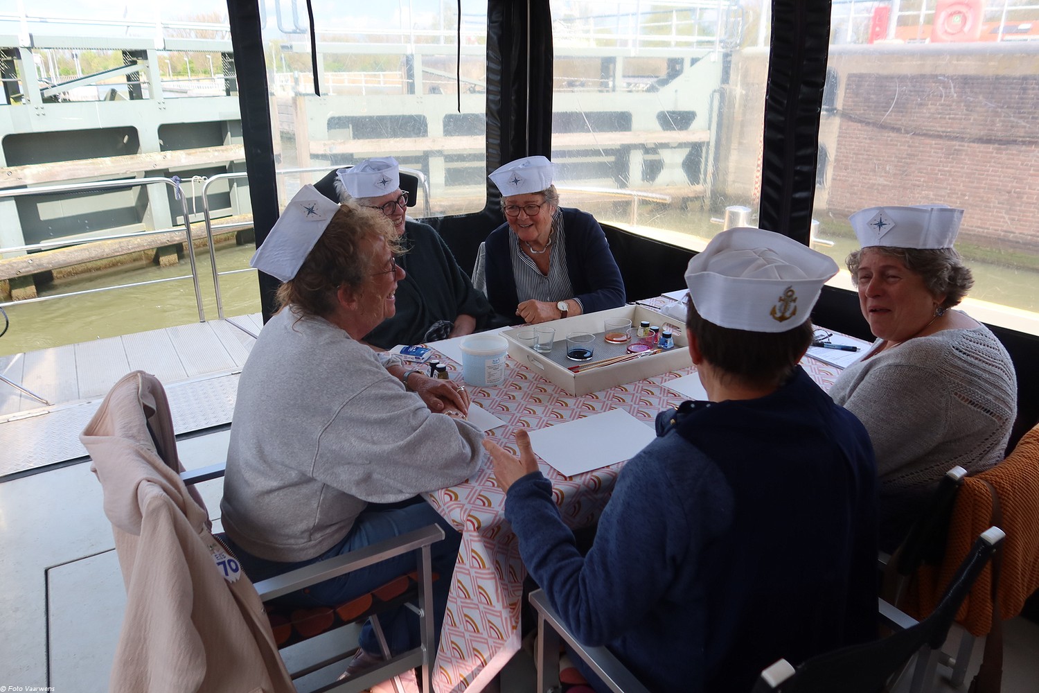 Het organiserend comité wilde de 70ste verjaardagen graag op de Vaarwens vieren. Dat hebben we geweten:-). Naast het gezelschap kwamen er veel volle tassen aan boord. Er bleek een heel programma opgesteld te zijn. Van twee dingen waren we op de hoogte: ze wilden graag naar Pampus en ze zouden gebak meenemen. De rest was ook voor ons een verrassing: En werden welkomstliedjes gezongen, matrozenpetjes uitgedeeld, er werd gemondschilderd, er werden canons gezongen, intussen wilden de dames ook nog graag bij Pampus aan de wal en hebben een korte rondleiding gekregen van een vrijwilliger op Pampus die toevallig ook de man is van een vrijwilliger, Anneke, bij de stichting Vaarwens. (Oké, zo toevallig was dat niet omdat wij van tevoren al met die vrijwilliger contact hadden gehad. Ons kent ons hè!) Er werden tegeltjes beschreven, er werd een collage gemaakt van de gemondschilderde kunstwerken. Intussen werden er Rotterdamse en Amsterdamse klassiekers/meezingers gespeeld. Wel met de vraag of het geluid wat harder mag, want het is achterin niet zo goed te horen.
